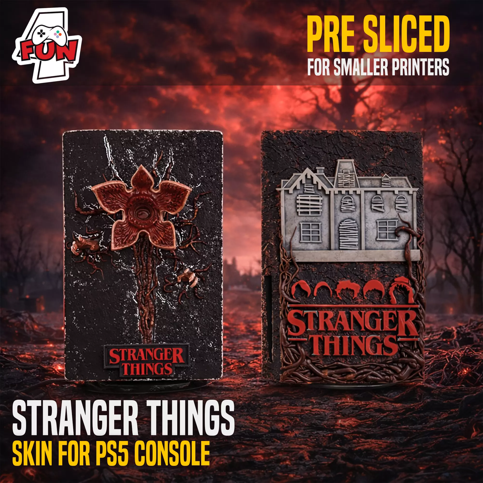 KEY FEATURESStranger Things inspired design (Upside Down look & creature details)Highly detailedPre-sliced for smaller 3D printersOptimized for PLA printingDesigned specifically for PS5 consoleLooks great painted or printed in dark filaments