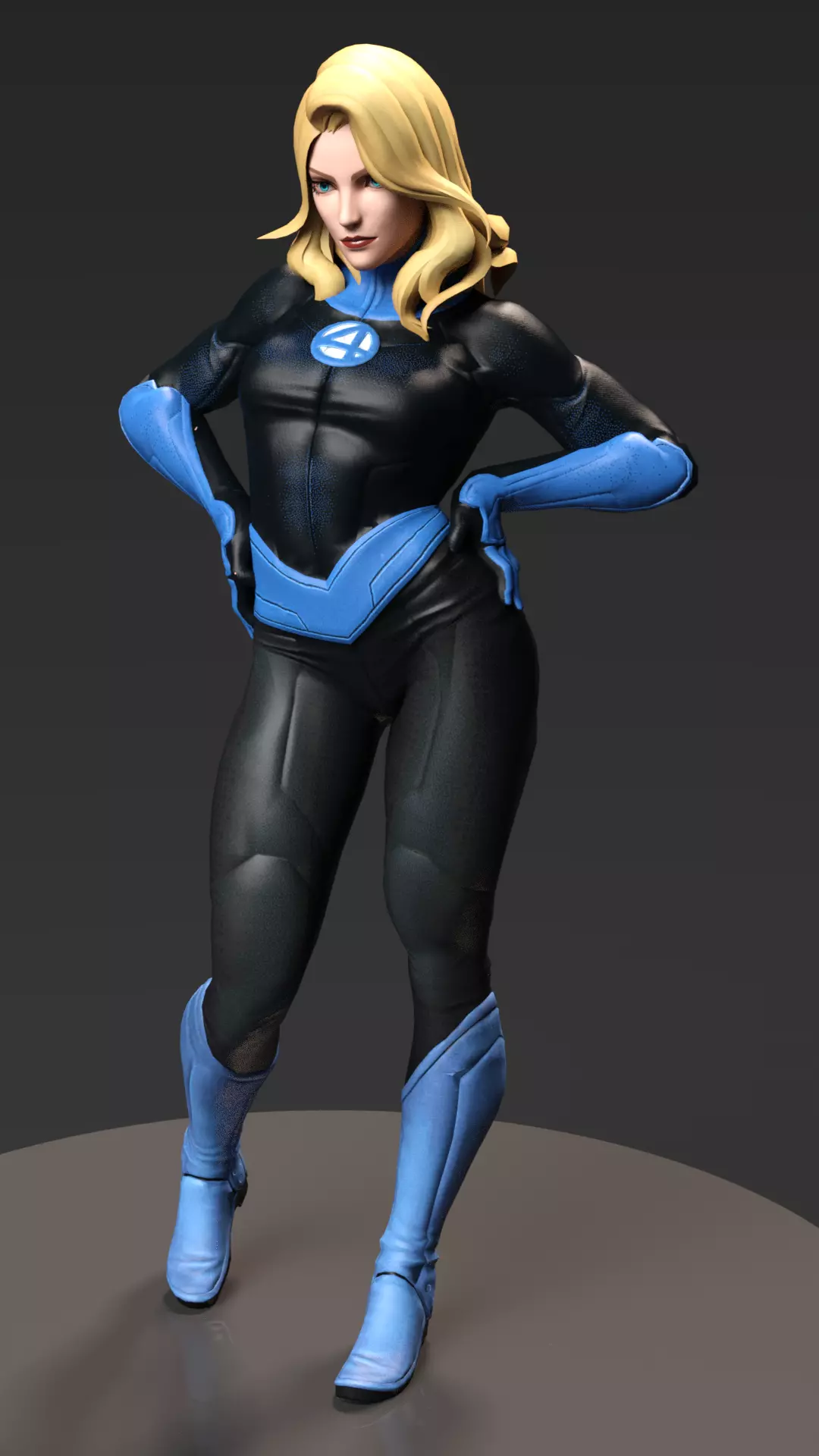 A high-quality 3D model of Sue Storm, Marvel's Invisible Woman. The design features a modern variation of the Fantastic Four uniform, using a black and blue color scheme. The render is stylized, focusing on the musculature and the texture of the suit, ideal for a collectible statue or a fighting game character.