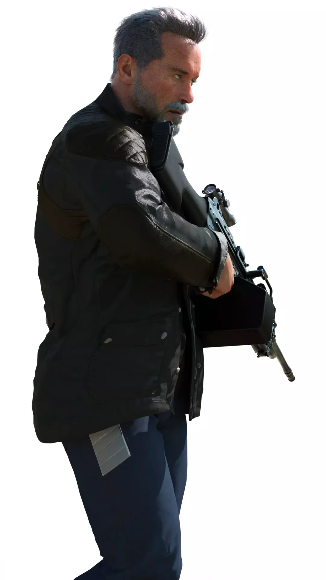 An impressive, high-fidelity 3D render depicting the legendary T-800 (portrayed by Arnold Schwarzenegger) in his older, more mature version, similar to The Guardian or the version from Terminator: Dark Fate. The model features gray hair and a beard, with an intense and determined gaze. He is wearing a dark, military-style or leather jacket over a black shirt and blue work pants. He is armed with a heavy machine gun (possibly an M249 SAW or similar) equipped with a drum magazine, in a stance of advancing or patrolling. The photorealistic detail extends to the texture of the clothing and the metal of the weapon. Spent bullet casings are visible on the base, suggesting recent action. The background is black, isolating the figure on a dirt or oxidized metal platform.