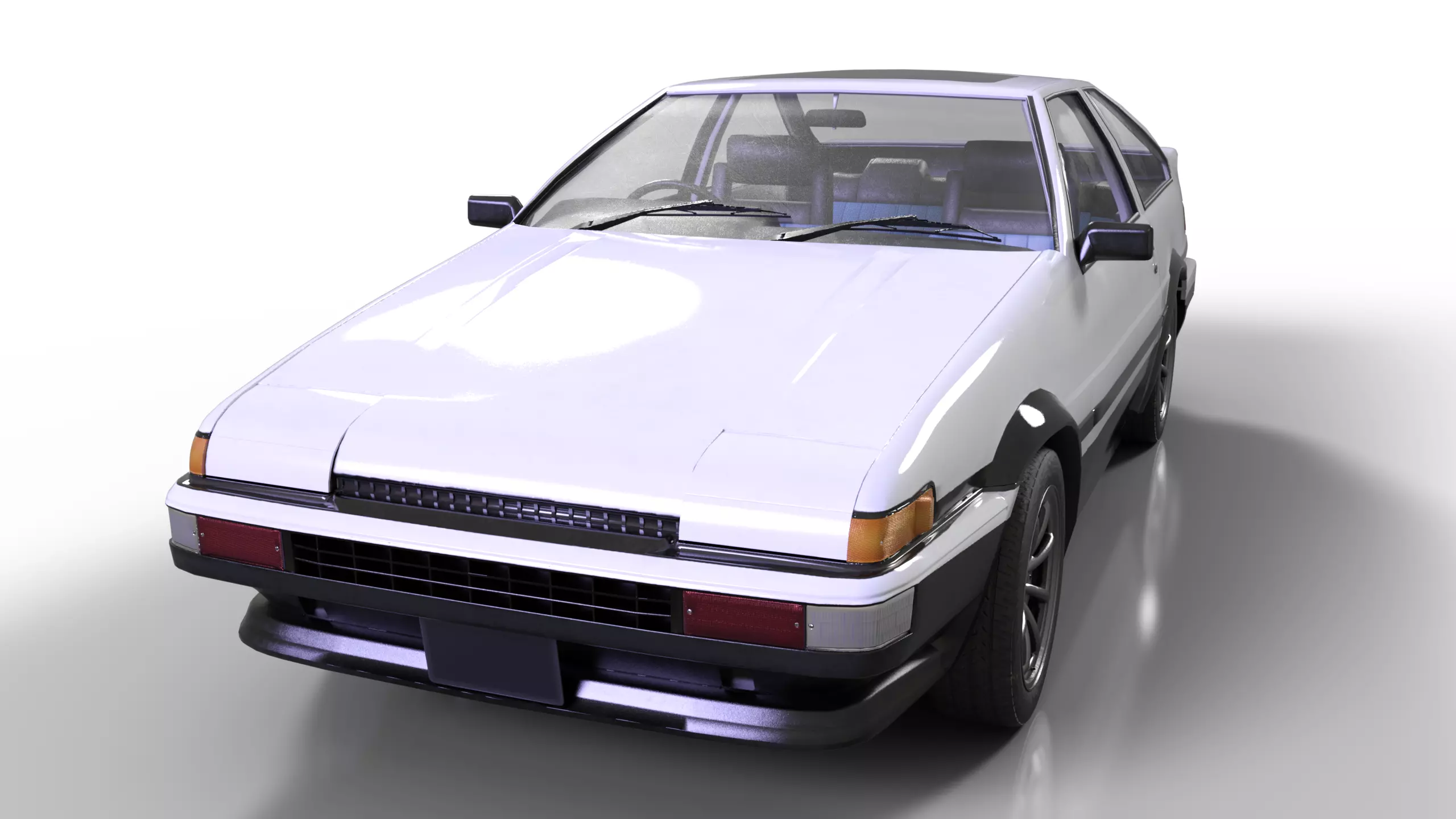 A detailed 3D render of the iconic Toyota AE86 Sprinter Trueno, famous for its timeless design and status as a motorsport legend. The model captures the essence of the car with a clean white finish, closed pop-up headlights, and a design that evokes the nostalgia of 80s Japanese sports cars. Subtle lighting highlights the body lines and glass details.