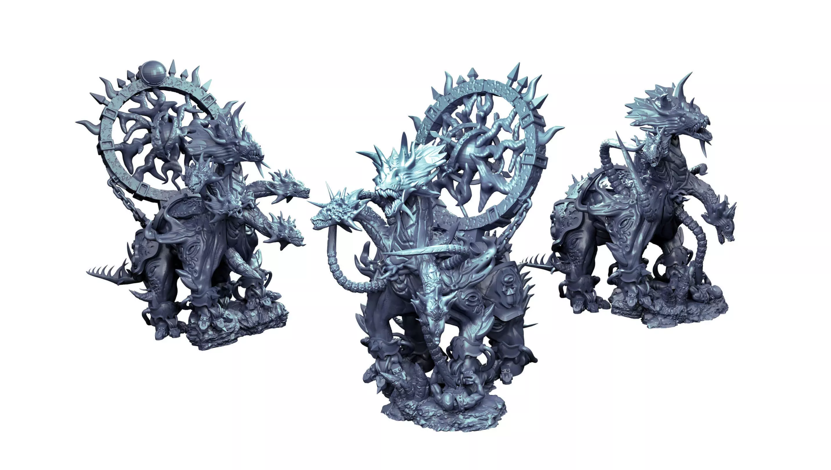 Hydra and dinosaur themed vortex beast proxies for use in wargames/tabletop games. The Hydra version has 3 main versions, 1 with 5 heads and two with 3 heads (also has 1 version with out a back ring). The 3 headed hydra vortex beasts are also crushing a foot solider against the rock.