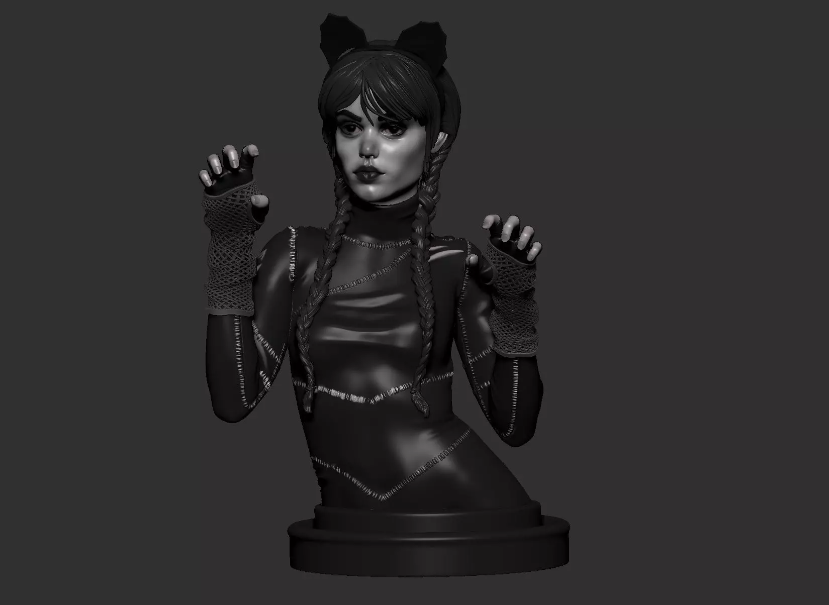 Wednesday, daughter of Gomez and Morticia Addams, is a student at Nevermore Academy. Her life is full of mysteries. She also has psychic powers and can read the past. She is always ready to solve new mysteries and amazing detective problems. Wednesday is played by Jenna Ortega. This is stylized fanart.Shown here is a figure of Wednesday in a cat suit. Please note that if you need a different size, please scale it yourself. The model is presented in color, as well as in different materials for a better visual presentation. There are also two categories of models with different numbers of polygons. The model is presented in STL, OBJ, FBX format. If you have questions about the model you bought or work for me to create similar figures, write me in private messages.