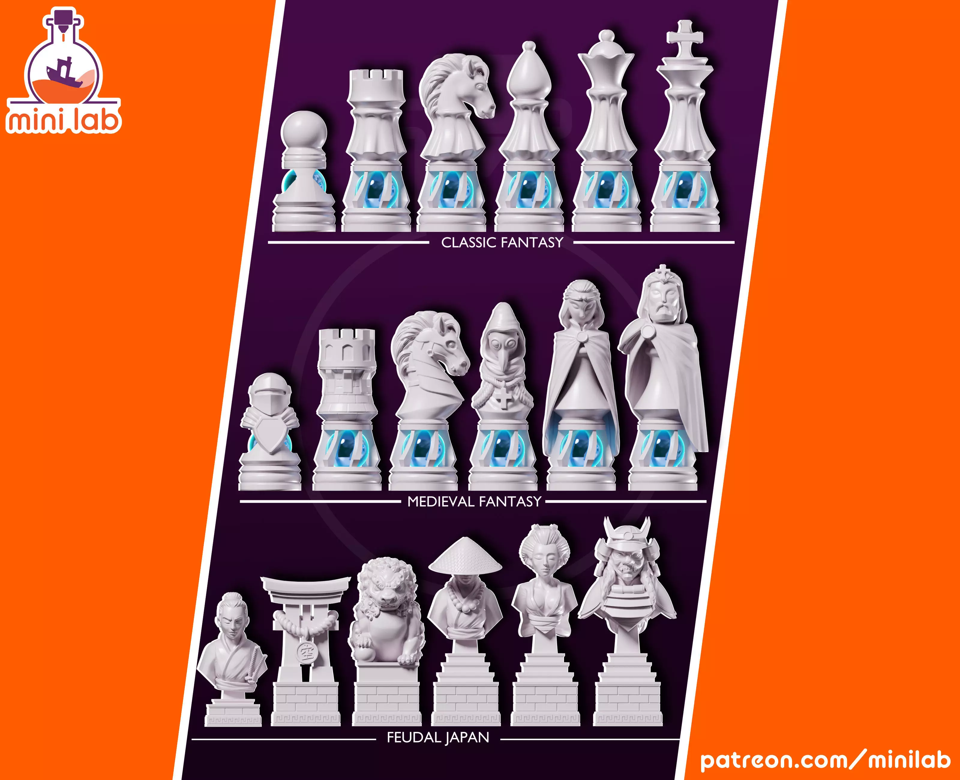 Contains 3 sets of luxury chess pieces, with different themes, 1 Classical set, 1 European Medieval set, and 1 Feudal Japan set. Each of the sets have six pieces King, Queen, Bishop, Knight, Rook and Pawn, 2 of which are Classic and Medieval requiring the use of marbles to give pieces the pieces they are inserted at the bottom of the bases that have a pressure cap. All sets have a base of 4cmx4cm and a maximum height of 13.5cm.