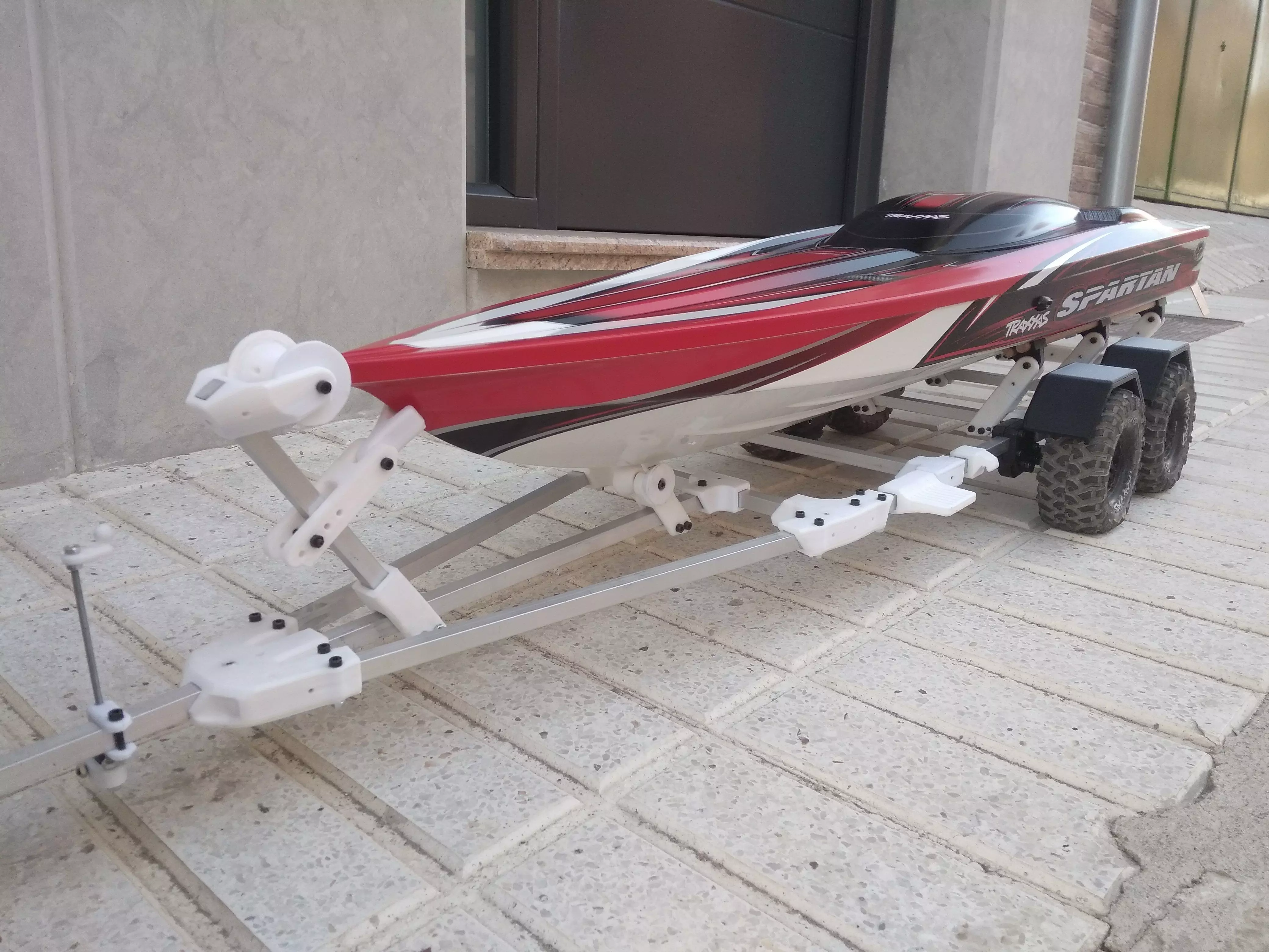 Boat trailer, customizable in length and width. For its construction you need 3 metric screws and 10x10mm square aluminum rod is recommended. You can also buy crawler wheels from 90 to 110mm. It has independent suspension on each wheel increasing the realism of the trailer. It has a manual winch with which you can hold the boat and introduce it directly into the water.It can be printed on any 3D printer, using PLA, in the orientations shown in the images.