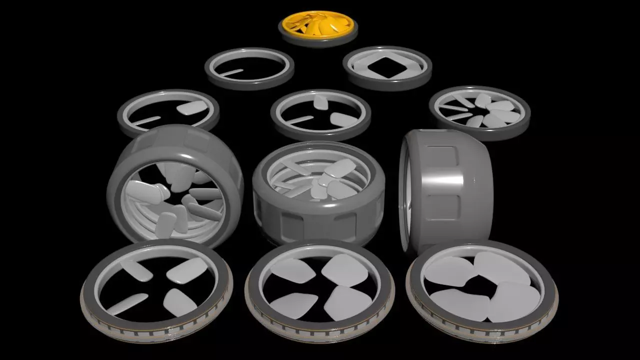 slim / rim driven / thruster experimentation kit. multiple test blades / single radius.all blades are [ airfoil ] shaped. rugged 360 degree radial airfoil lift effect.thruster housing wants to be lifted.experiment with combinations and shapes / lock them in place for mechanical timing / max. efficiency.experimental rim driven hexagon thruster blade / silent.Modular stackable drives. / lengthen housing / casing.3 phase +1 open / coil / wiring setup ready. included full stator housing model including balls / spheres for thruster rotor bearing system.