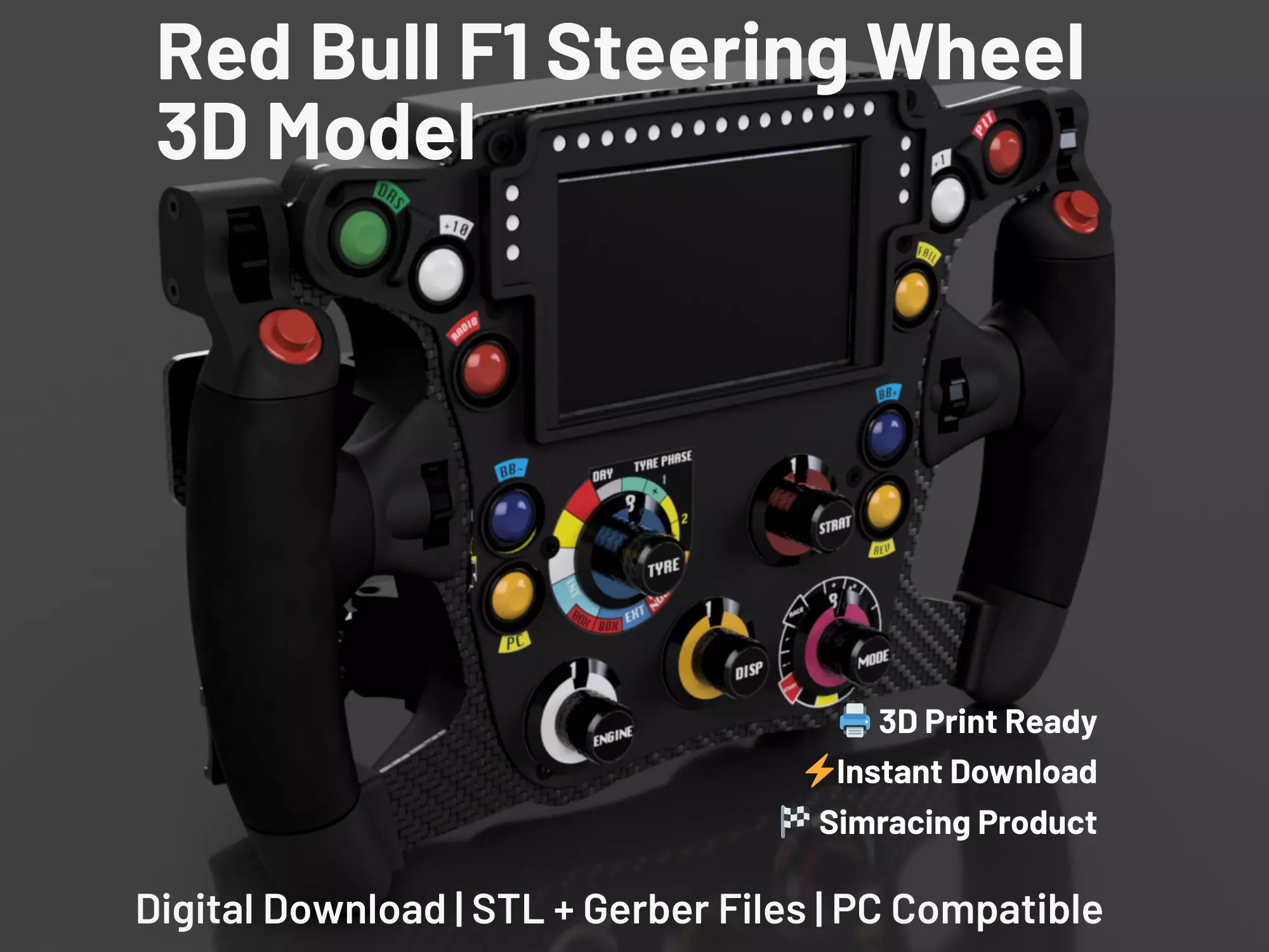 Is this an official Red Bull product? No, this is a fan-made 3D model.Red Bull Steering Wheel 3D Model - custom design 3d files DIY for Sim Racing - download now!