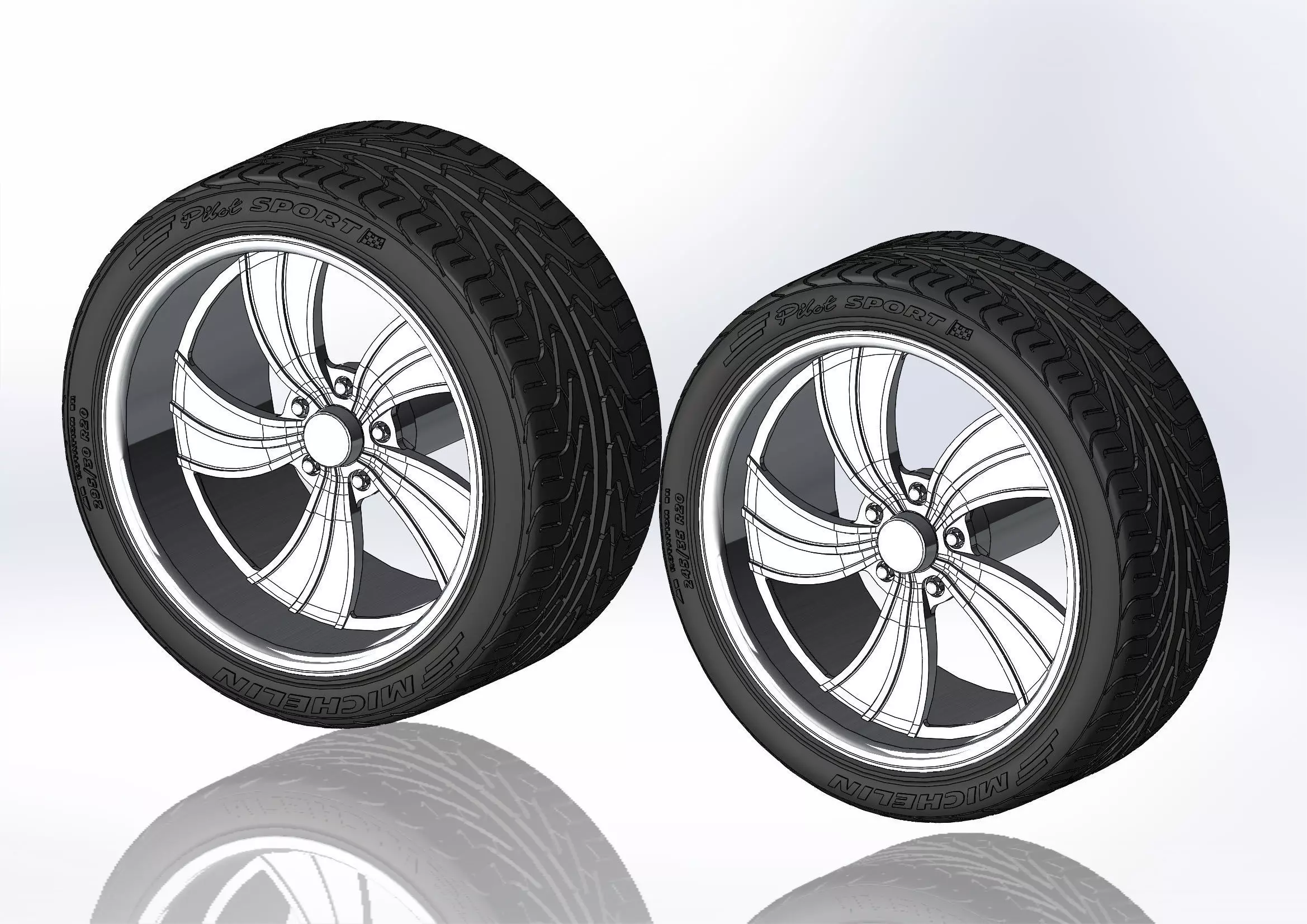 3D-printable wheels (rims and tyres separately) for your scale or RC model. Rims style - Intro Wheels Twisted Vista II; front - 20x8.5, rear - 20x11; Tyres - 245/35 R20 front and 295/30 R20 rear, with a detailed tread pattern