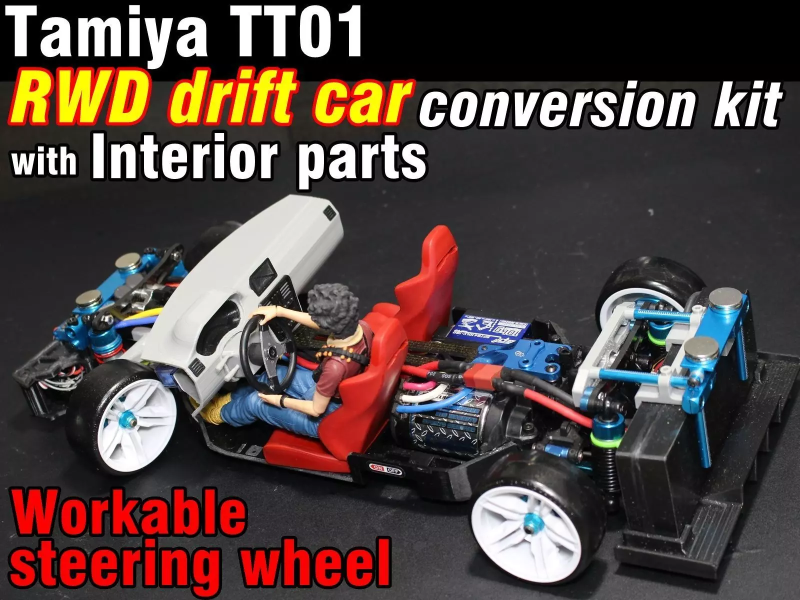 You can transform your sleeping Tamiya TT01 into RWD drift car with very little cost.This kit includes various interior parts. You can move the steering wheel, and if you use articulated figures, you can make a realistic drift car.