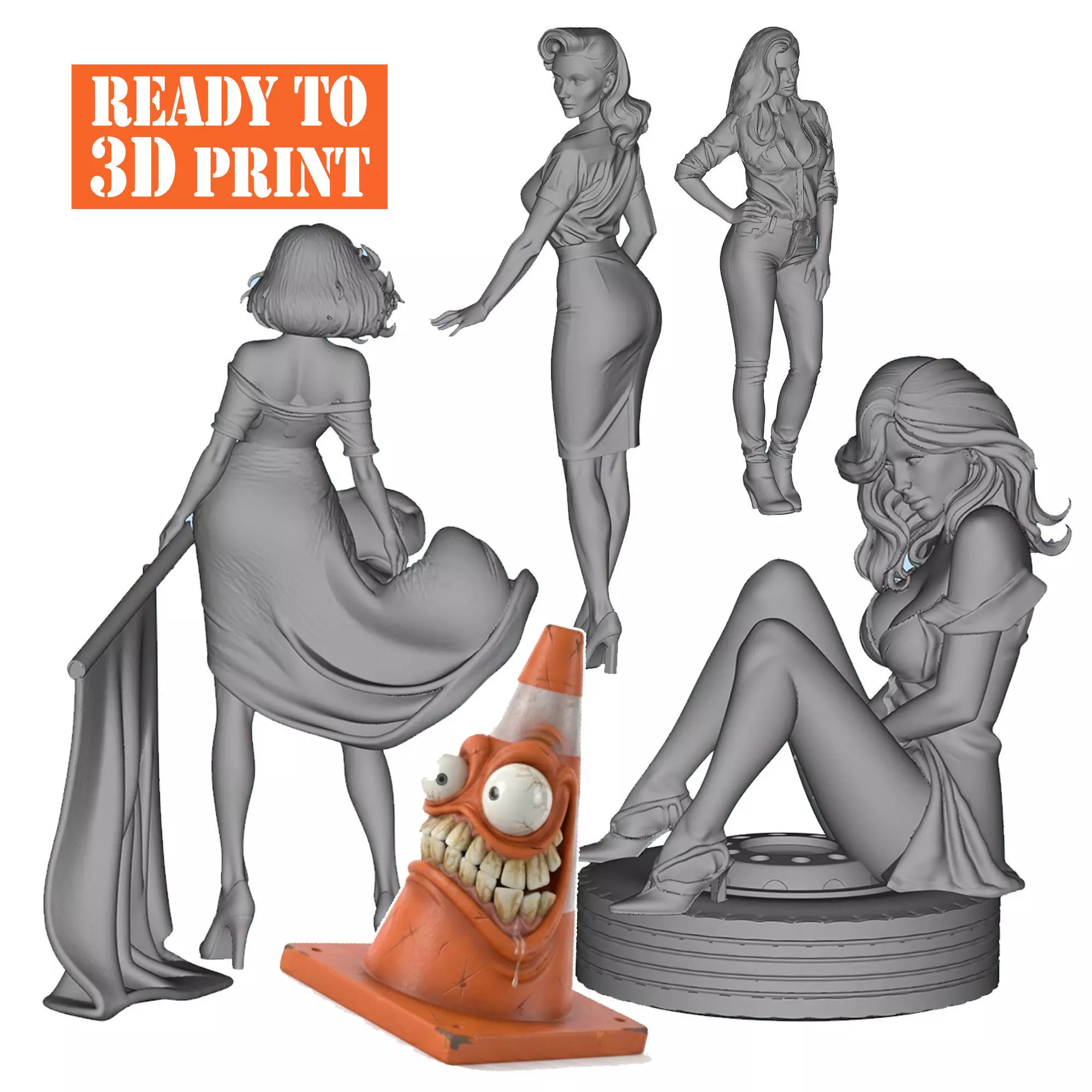 **Attention:-For experienced model builder-Parts could need some adjustments with files or sand paper-Take care when you remove the supports-Parts should be glued.-Not recommended for kids-Be careful with the alignment of pieces when gluing.-Could need some sanding/ adjustments/ cuts / scratch built parts to fit your chassis / model kit / Wheels-Check dimmensions of your model before printingHigh-detailed 3D printable miniatures for diorama builders. Optimized for resin printing. Includes: Flag Girl, Trucker's Wife, Workwear Chic, Retro Girl, and stylized Mad Traffic Cone.