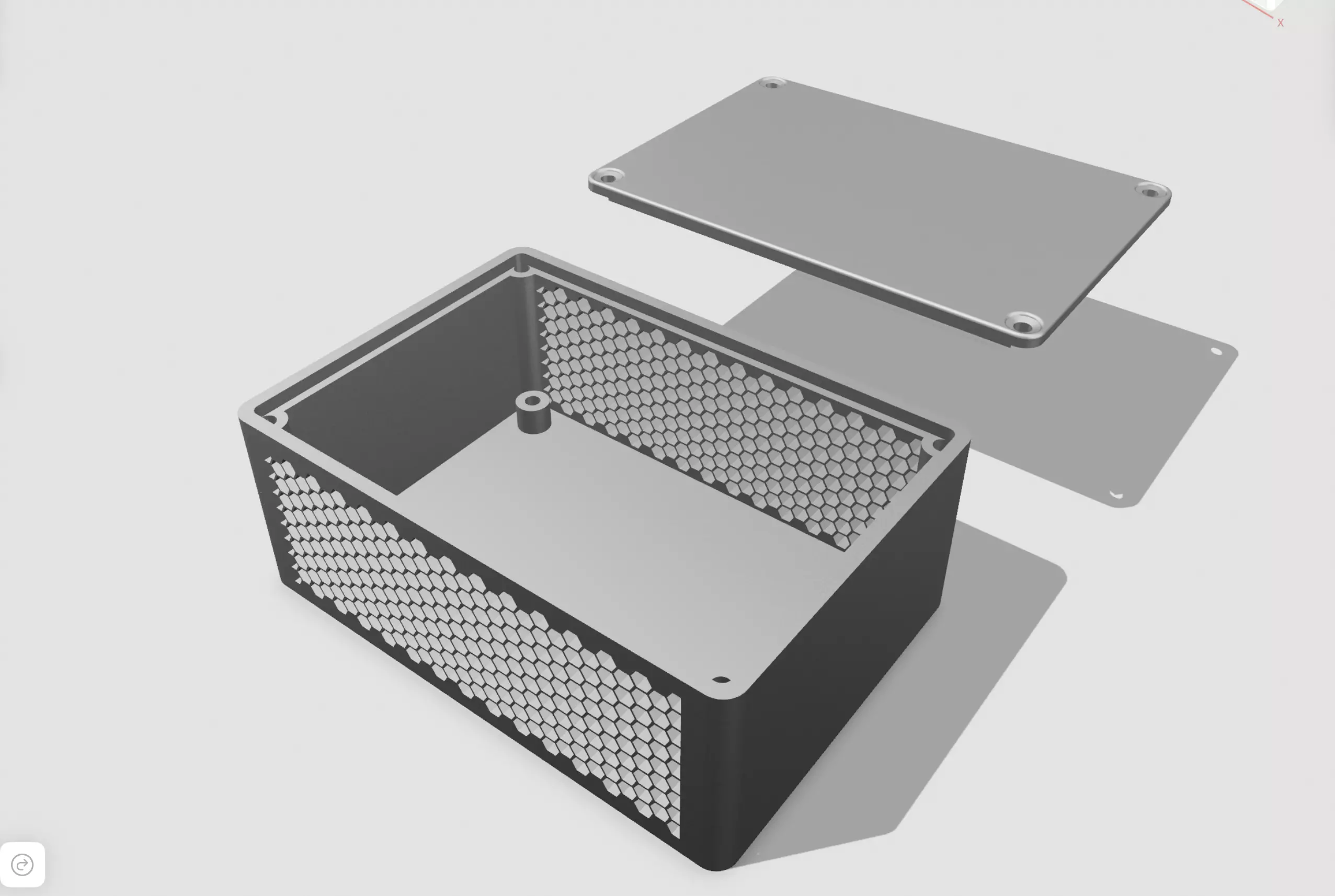 lid mounting: 4 M3 screwswall thickness: 2.5 mmround radius: 2 mmInterior4 standoffs for the boardscrew holes: M3 (Ø 3.2 mm)standoff height: 6 mmstandoff spacing:80 × 50 mm (universal)