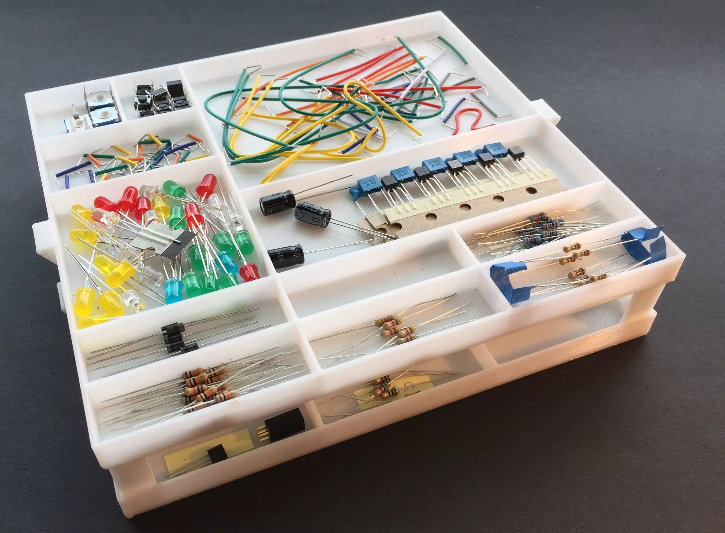 I’ve started learning to program Arduino, so I can incorporate active features into prototypes for my clients. Within the first few lessons in the basic introduction kit though, I found that effectively managing the many small electronics parts was immediately a high priority, so I designed this tray system for my workbench.