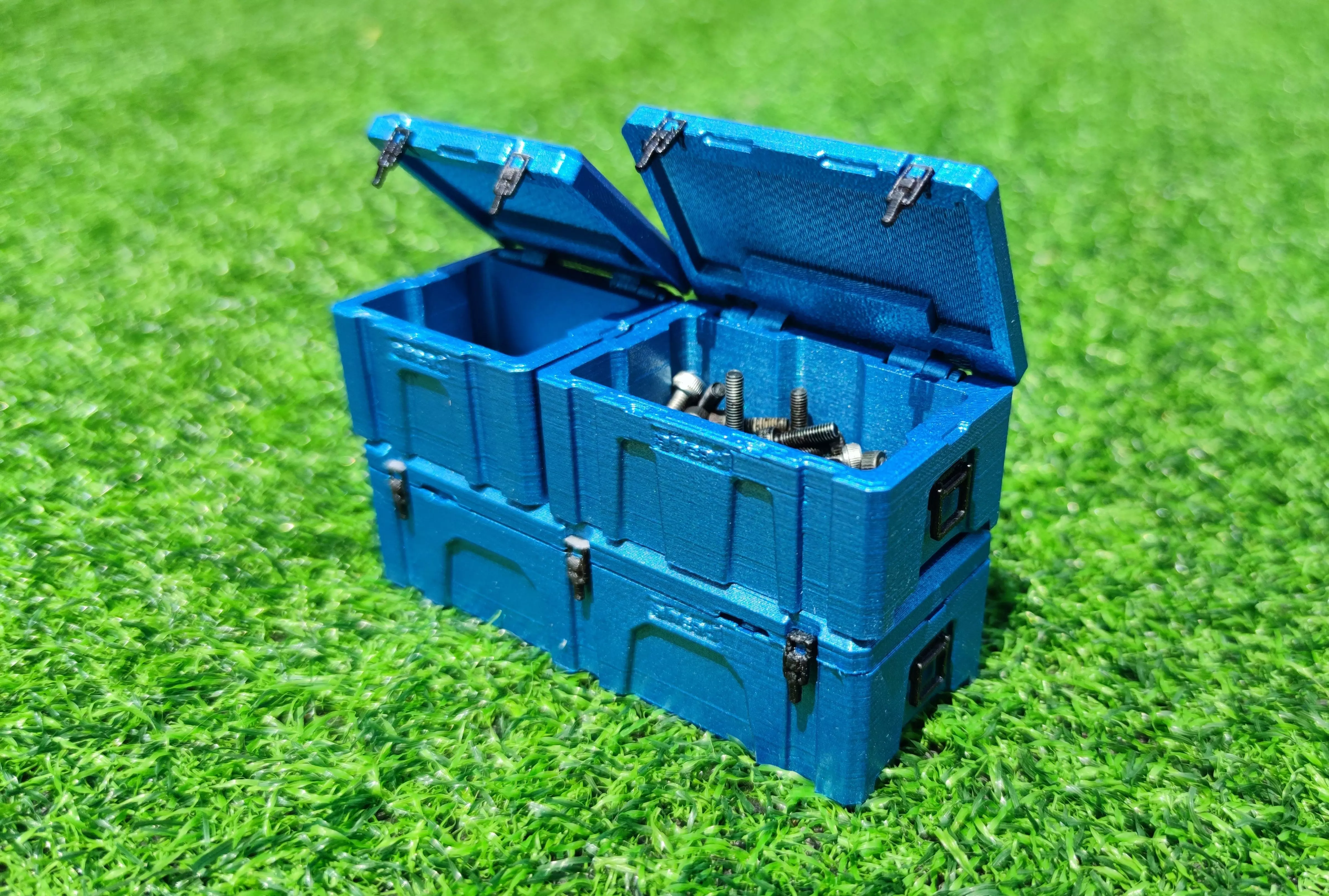 These stackable boxes are full depth, with hinges allowing the lids to be opened. This means spare screws, small toolheads, small spare parts, or even finished snack bar wrappings can be put in the boxes to keep the trails clean!