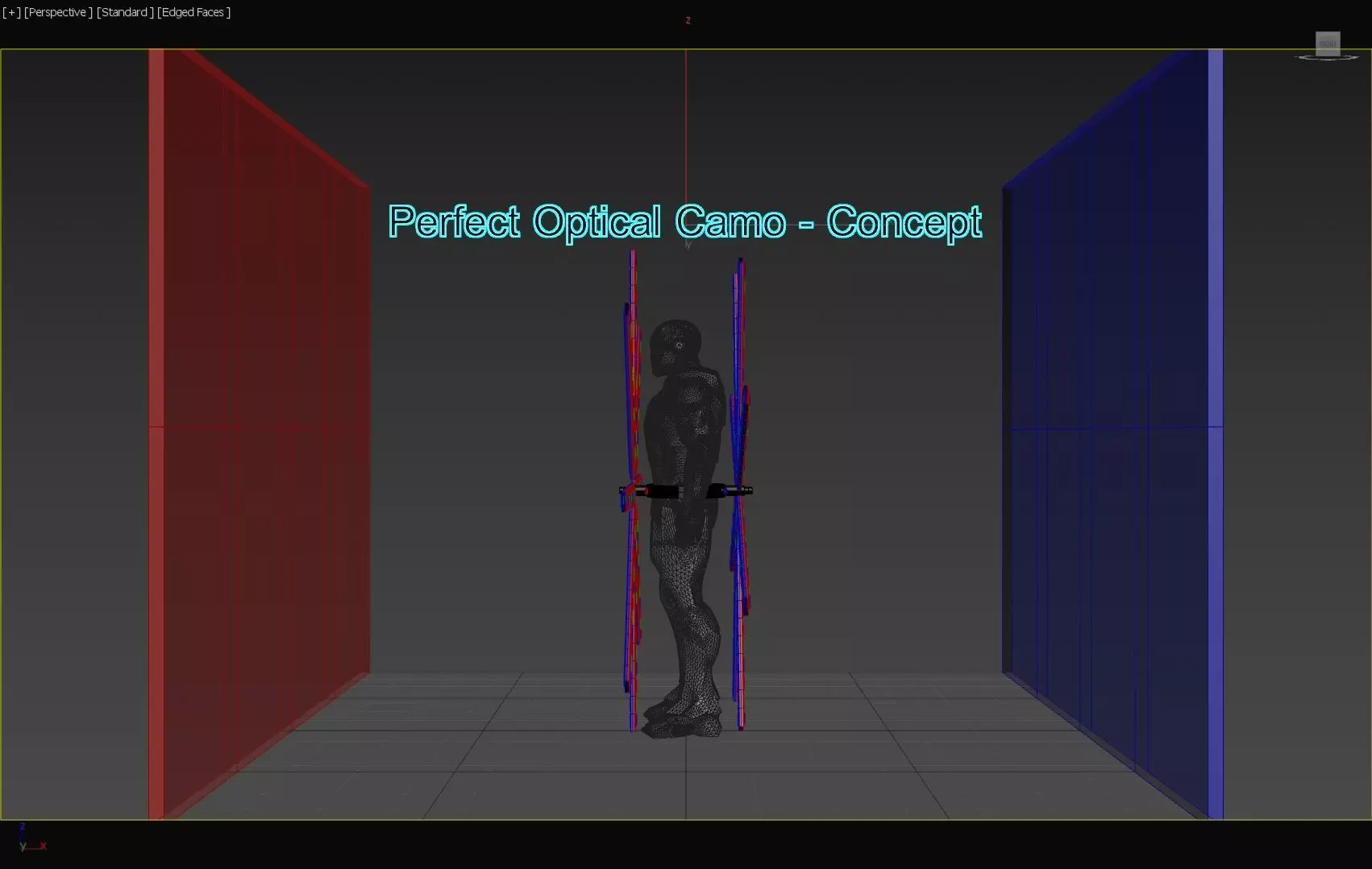 this will create a compound frontal photo projection, taken from the back, and seen from the front, and vice versa. the spinning strips will appear to become translucent, hiding the person wearing the device, from quite a good angle and distance. from a distance it will appear as if you are looking through the person wearing the perfect optical camouflage system tm. even from 45 degrees sideways, and even 45 degrees upward, will the person appear optically hidden by the magic of light, but since the wearer can look out undisturbed, by perhaps leaving out a small band around the system wearers eyes height, he can turn his body to keep facing a far, unsuspecting observer.