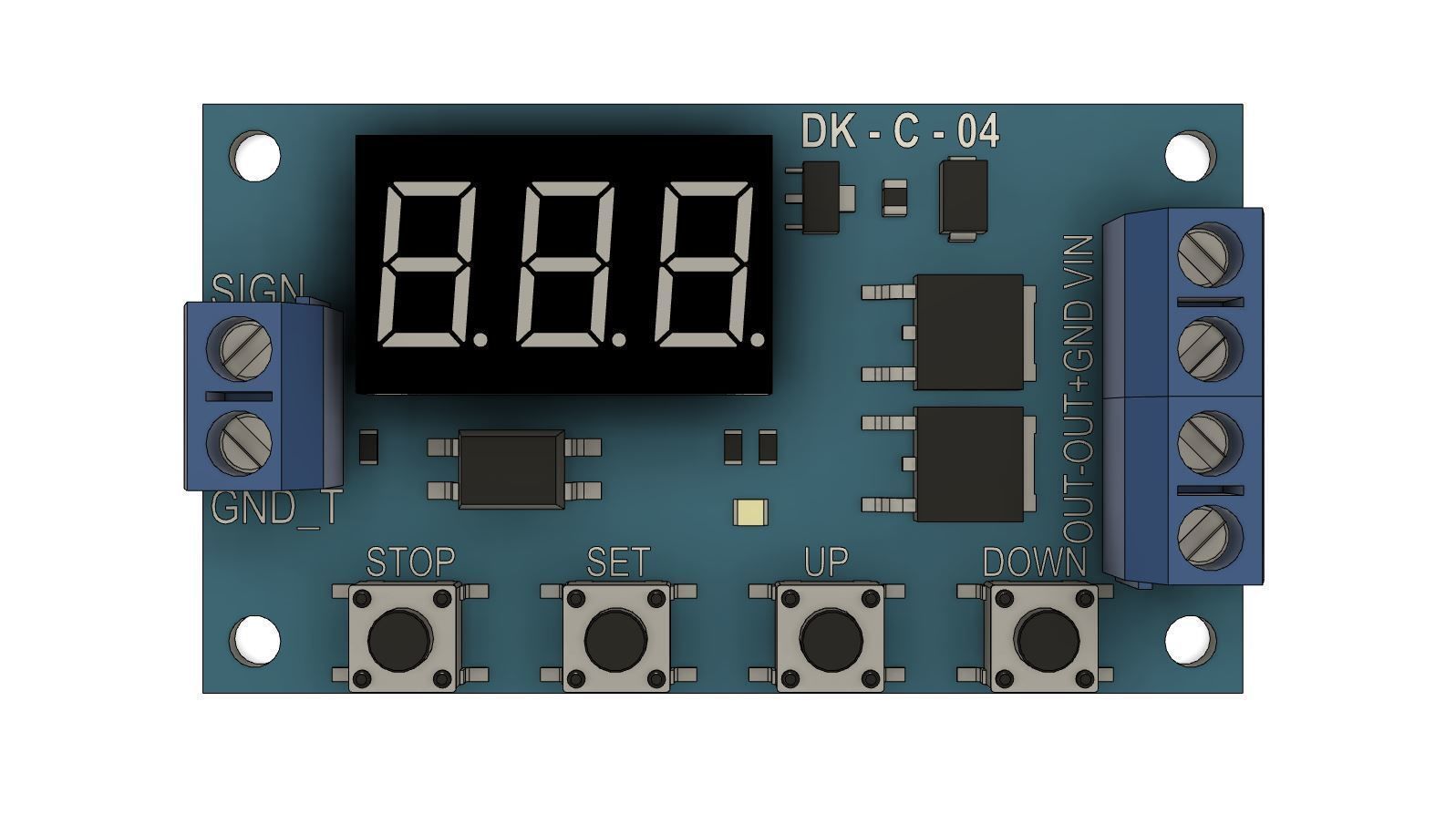 Programmable time relay, cyclic timer.The DK-C-04 electronic board model of the DCC-432 delay controller was originally built in a solid-state format with a high degree of accuracy.The model is perfect for the layout of this electronic board in the 3D assembly of the device you are designing, and will save you time.The overall dimensions of the model are indicated in the drawing. The model is made with one body.The inscriptions and symbols shown in the screenshots are made as separate faces of the body.But pay attention to the settings for importing models of your graphic editor. Some of them combine faces lying in the same plane. This leads to the loss of labels.