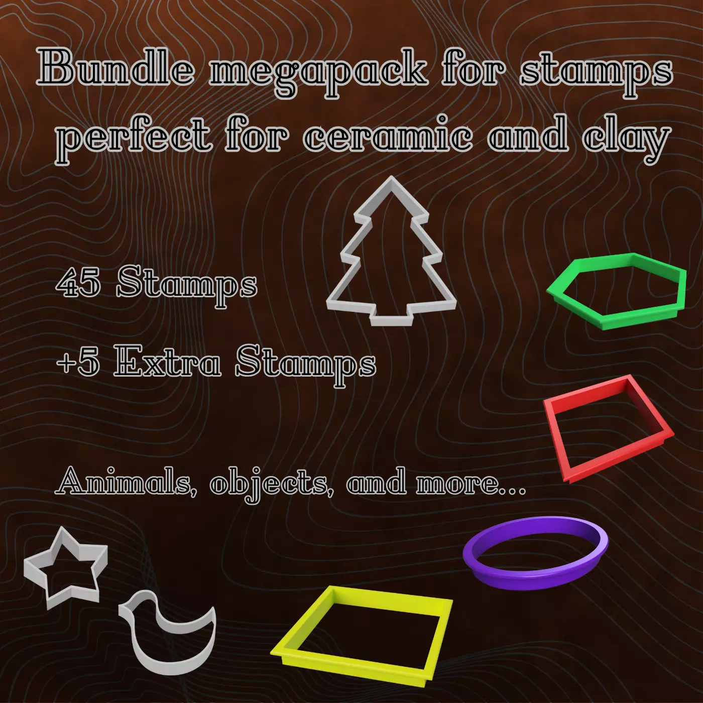 This complete 3D Stamp Megapack brings together 45 unique clay and ceramic stamps plus 5 exclusive cutout tools, creating the most versatile, practical, and creative collection for makers, artists, and hobbyists. Each stamp features a clean, simple, and well-defined silhouette designed to transfer crisp impressions onto clay, ceramic, polymer clay, playdough, and other soft modeling materials. From animals and nature motifs to symbols, objects, and themed shapes, every design offers high clarity, smooth contours, and consistent results—perfect for decorative textures, charms, ornaments, pottery, scrapbooking, and countless DIY projects.