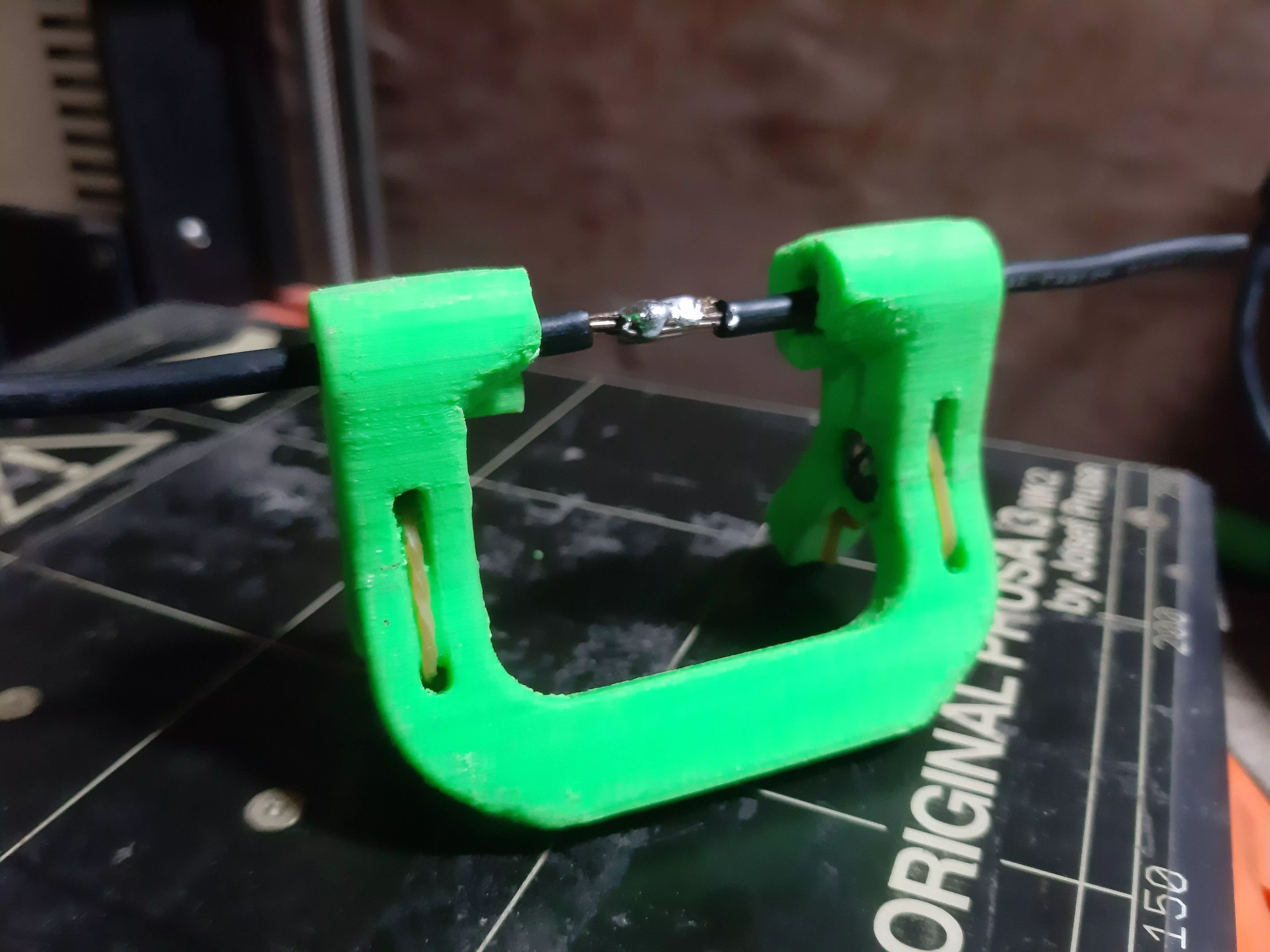 This is a cable wielding stand or you can call it cable wielding clipper. It has three parts. It will hold the cable by it's 4 claws. Claw will close by 2mm thick rubber band. Use rubber band with strong tension. Claws are jointed by pivot pins. I use two belt buckle chicago pins. Pins link given below. Use hard 3d printing filaments.