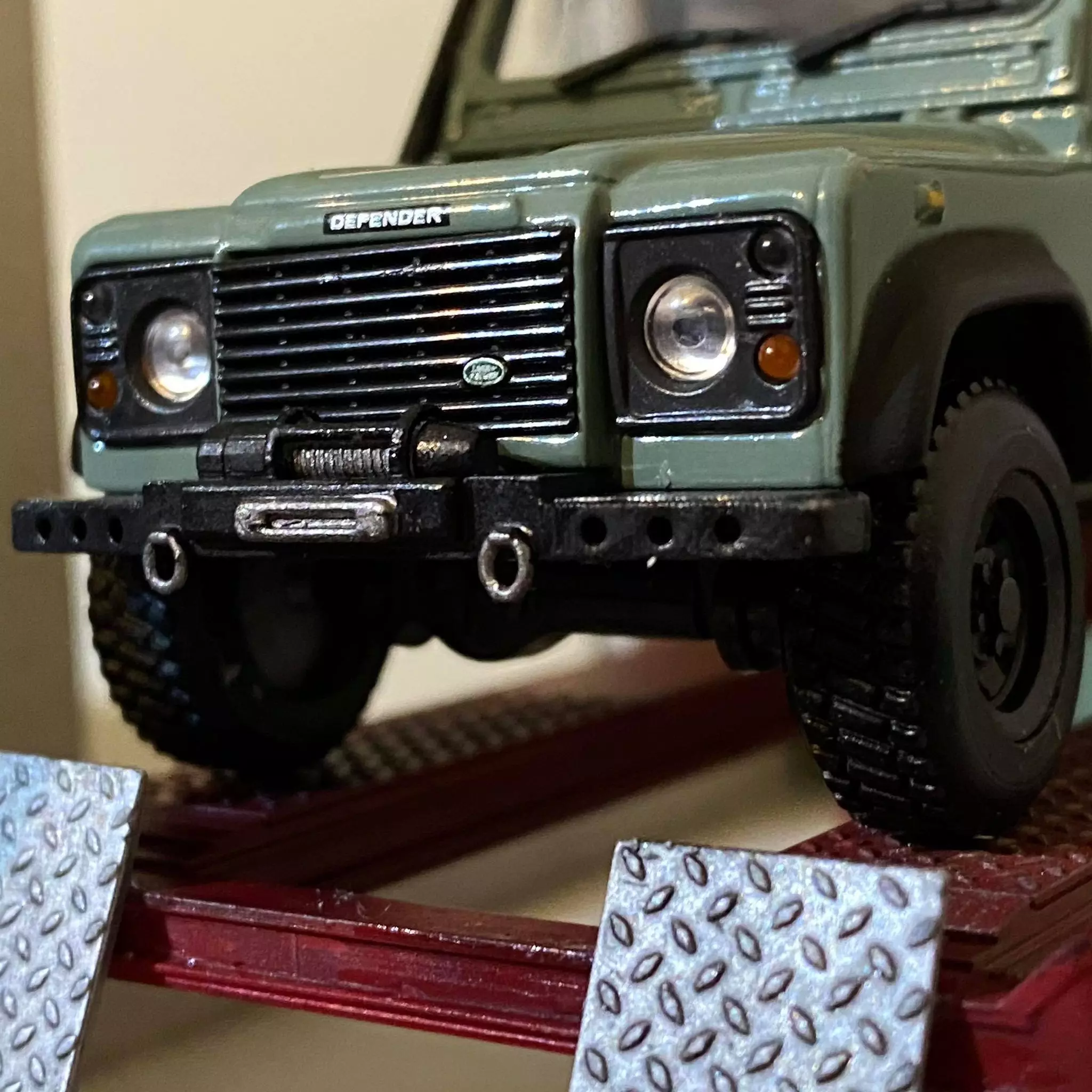 I wanted to take my Cararama Defender 110 off road, but I was worried about getting stuck in the mud. Not any more though as I've made this winch bumper accessory.