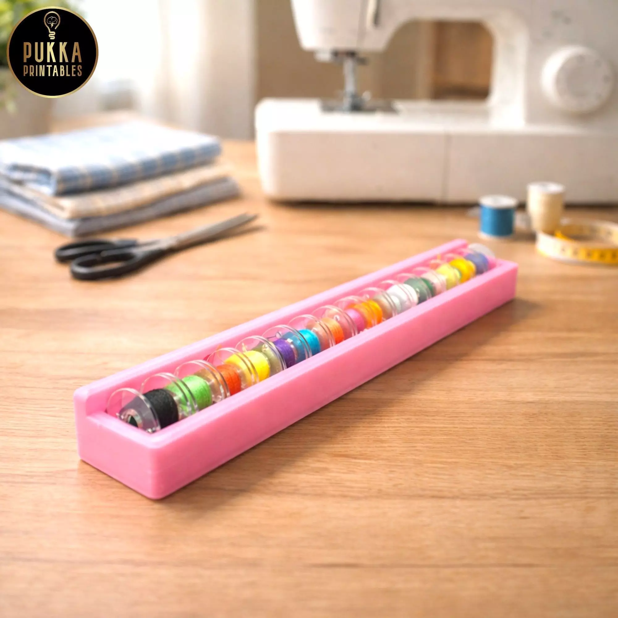 Holds up to sixteen 20 mm sewing bobbins.One-piece print with no assembly required.Support-free geometry for reliable printing.Can be mounted to a wall or used freestanding.