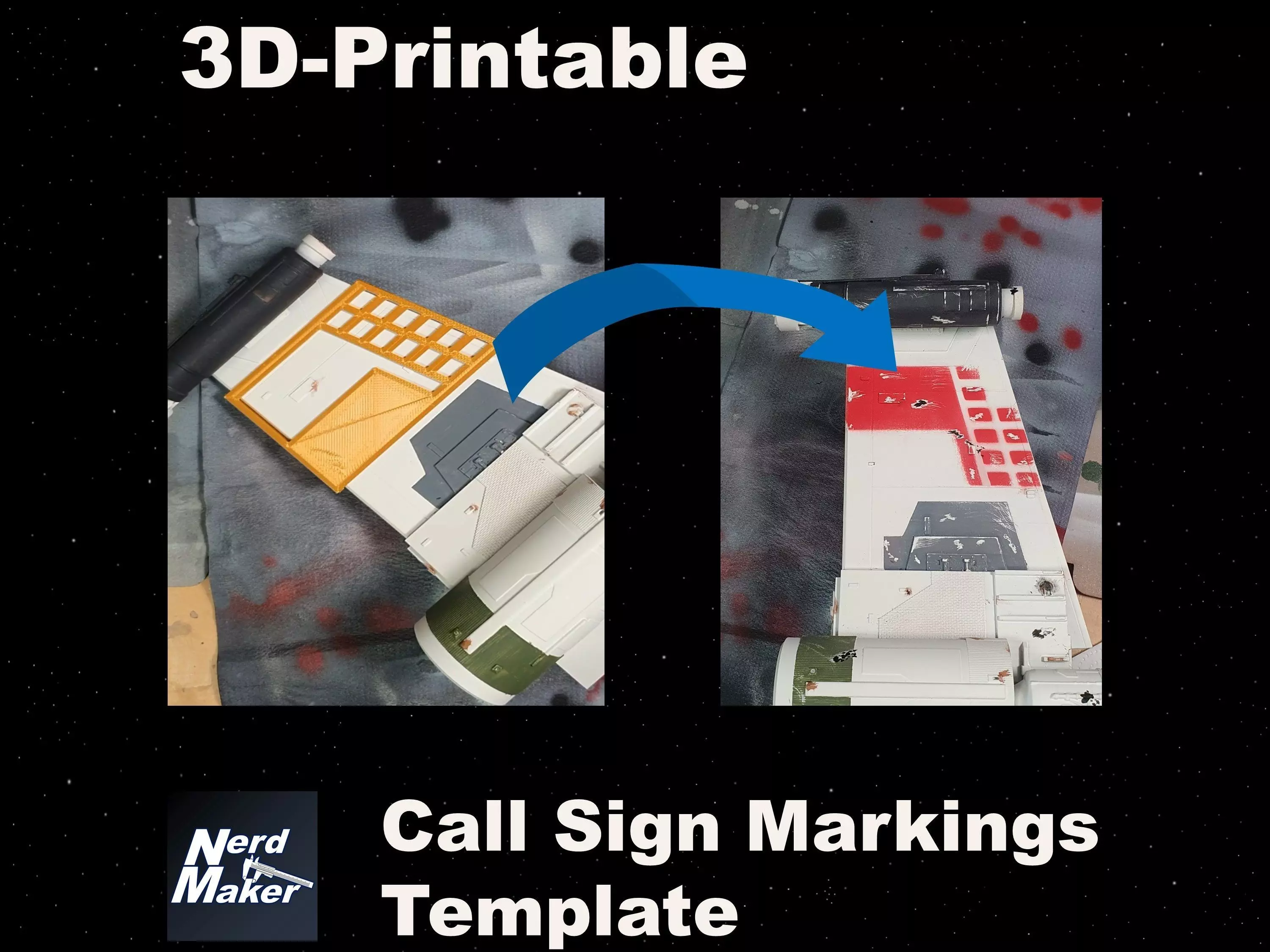 These are 3D-Printable templates to paint the Call Sign Markings on the wings of an X-Wing.No more time-consuming masking!With these templates you can easily paint the call sings 1 to 12. You Just need to mask up the not needed stripes according to the call sign you want to paint.The native scale of the templates is 1/24 for studio scale X-Wings. But you can scale them to fit your needed scale.