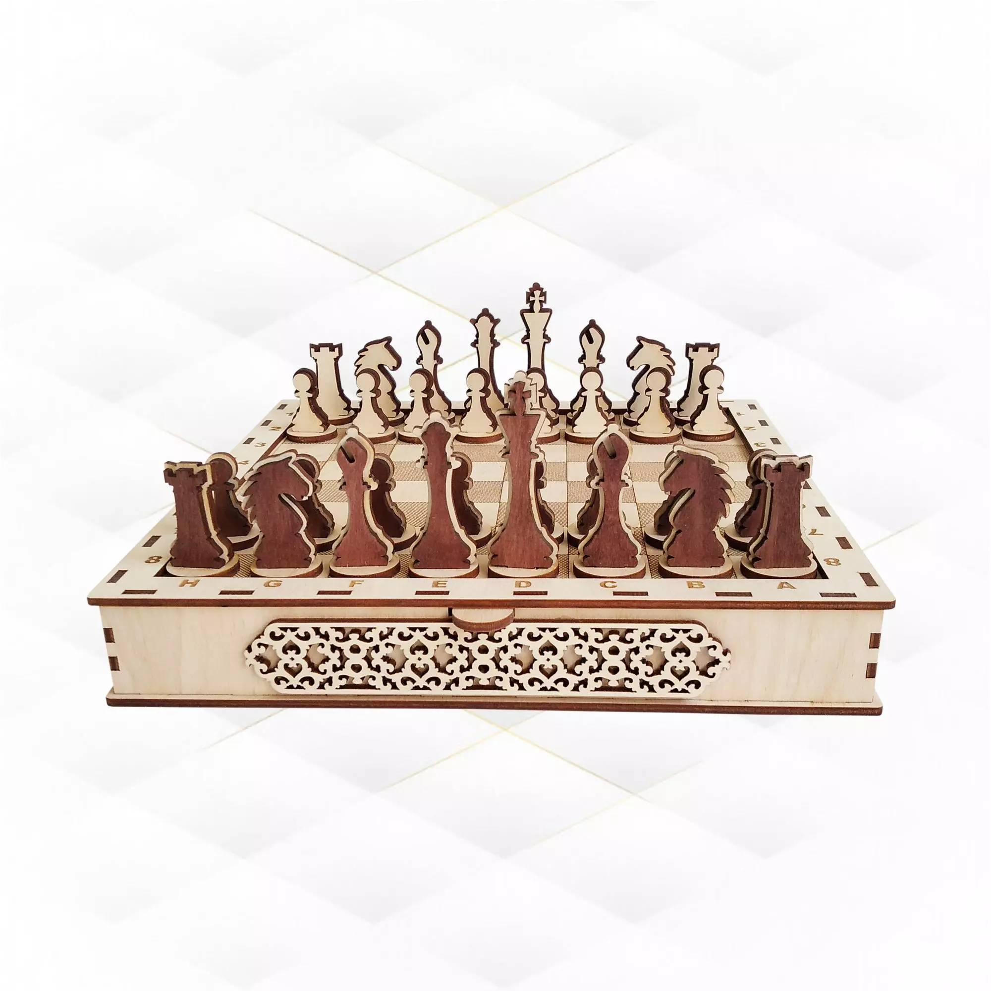 Chess set with board, laser cutting design. Svg dxf files for laser cut. Chess digital pattern laser cutting, engraving file. Laser svg dxf file. Laser model, laser pattern. Digital files for laser cut. Laser template, svg laser, dxf laser, cdr laser, template laser. Ready use laser cut project. Original, unique product design will help you create a stunning gift or product for your store. Universal product! It can be made from plywood (as in the photo), cardboard or other material. Additionally, painting in your favorite colors, you will receive an exclusive gift, well, just a gorgeous thing!