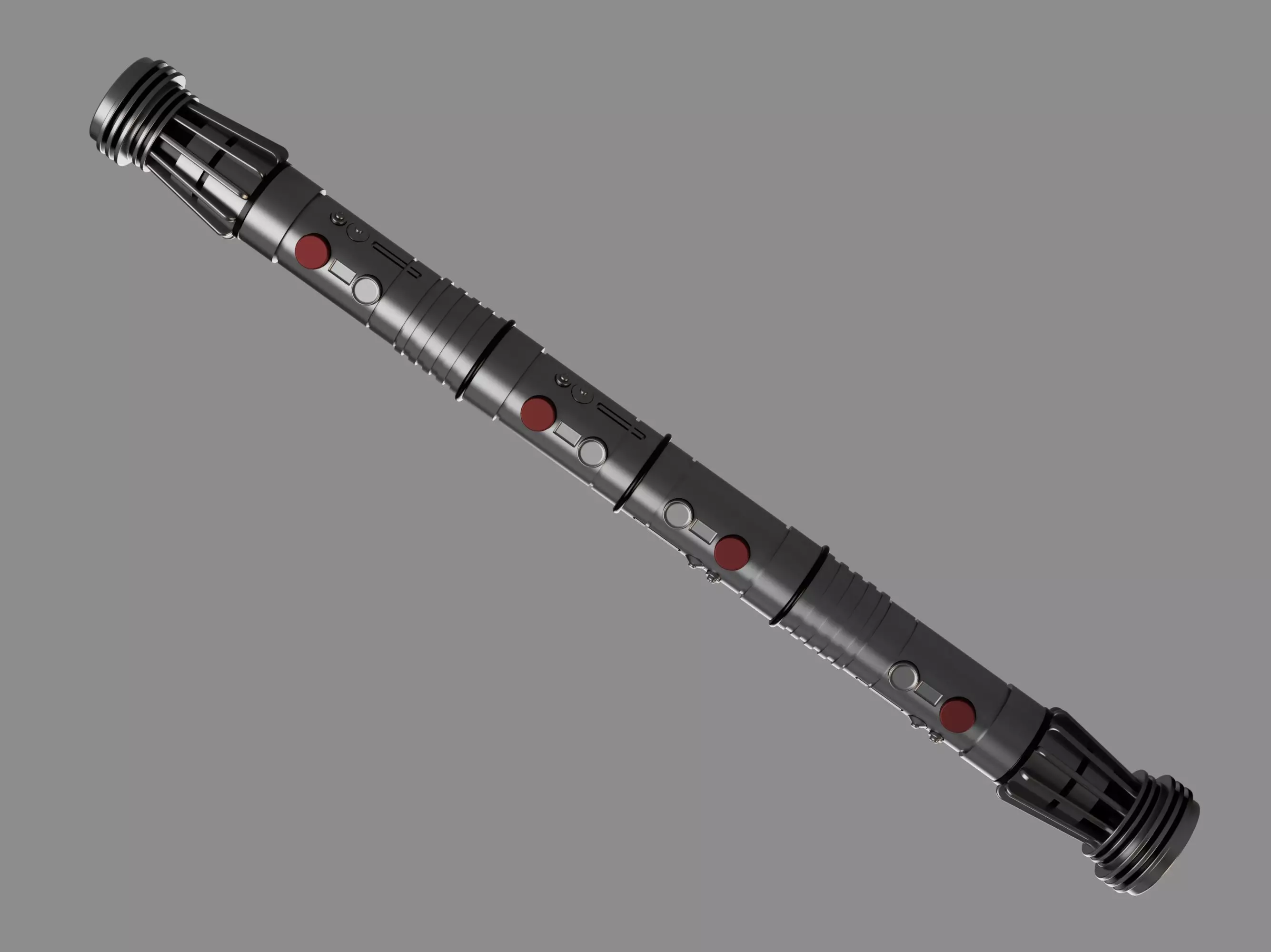 The iconic double-bladed lightsaber of Darth Maul as seen in Star Wars (Episode I) – The Phantom Menace. The design allows for the joined double-bladed lightsaber to be separated single bladed hilts with a discrete extendable connection cylinder.