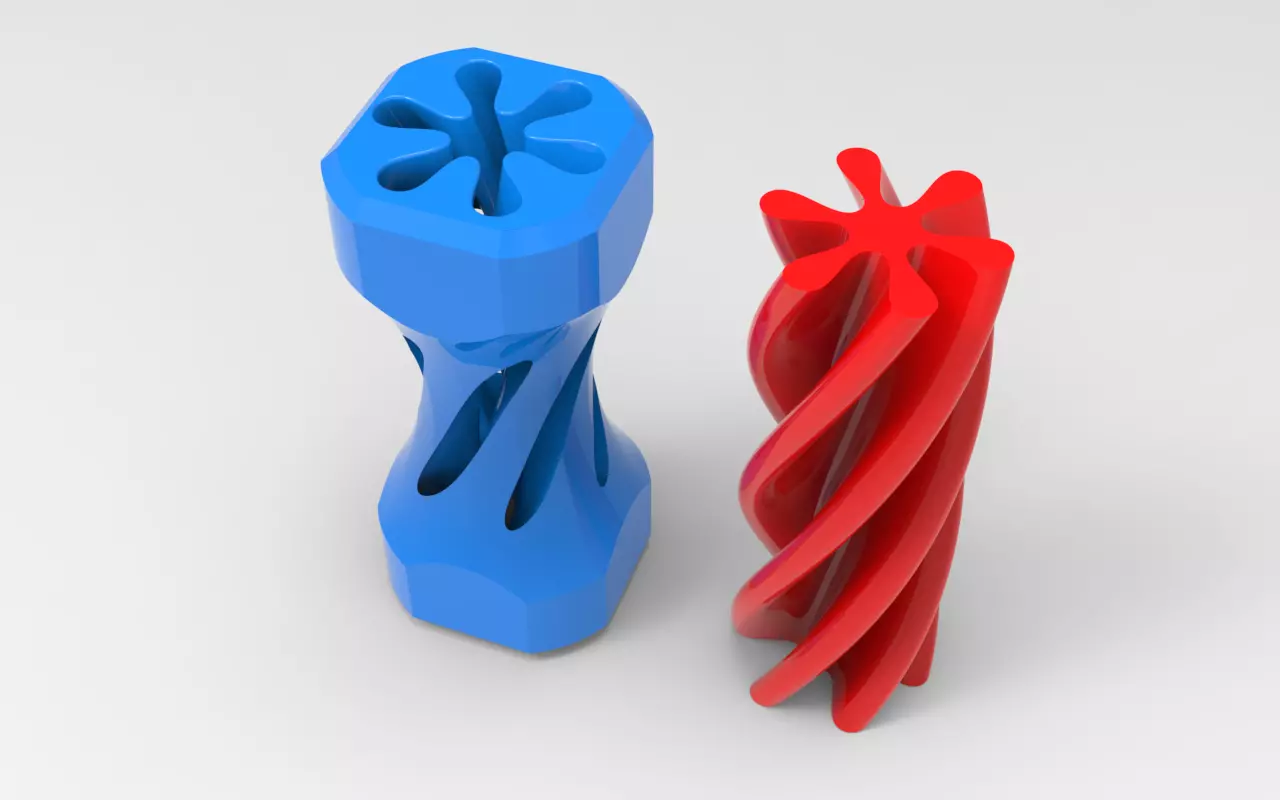 This 3D model presents a captivating study in form and void. Two intersecting cylinders are intricately carved with complementary spiral cutouts, creating a mesmerizing interplay of light and shadow. The resulting form is both visually striking and conceptually intriguing, offering a unique blend of geometric precision and organic flow. This model is well-suited for a variety of applications, including: