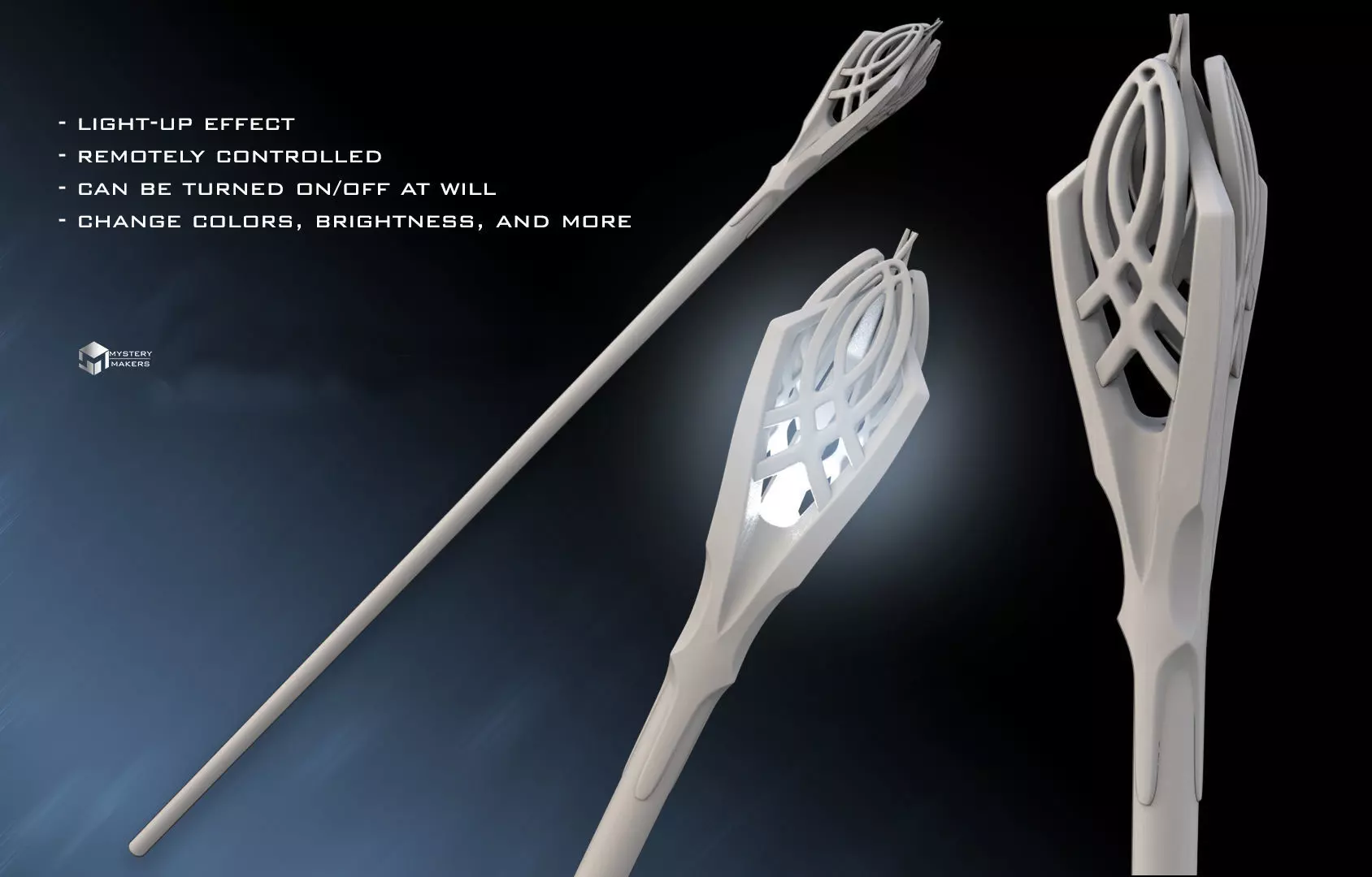 For the LED version, I added a small removable detail at the tip of the staff so you can access the LED and replace the batteries when needed. Instead of magnets, I went with double-sided transparent Scotch tape — sturdier, reusable, and reliable. After a few months of use, you might just need to scrape away some old tape, but it holds up great!