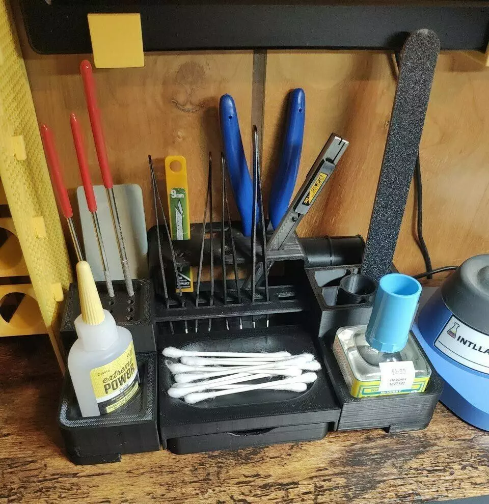 The model consists of an organizer tray for hobbyist, composed of 7 sections and a drawer.with a central space for Q-tips or different pieces. two lateral spaces for glues, (one Gorilla glue and one Mr. Cement glue). A space for 10 files and another for different sanding sticks.A shelf with capacity for 5 tweezers. And in the rear part another shelf, this time for 2 xacto knifes and a cutter, and three spaces designated for a sprue cutter and other pliers. And finally a holder for 2 small tapes, and on the opposite side, an small space for a pencil holder, or whatever you need to add.