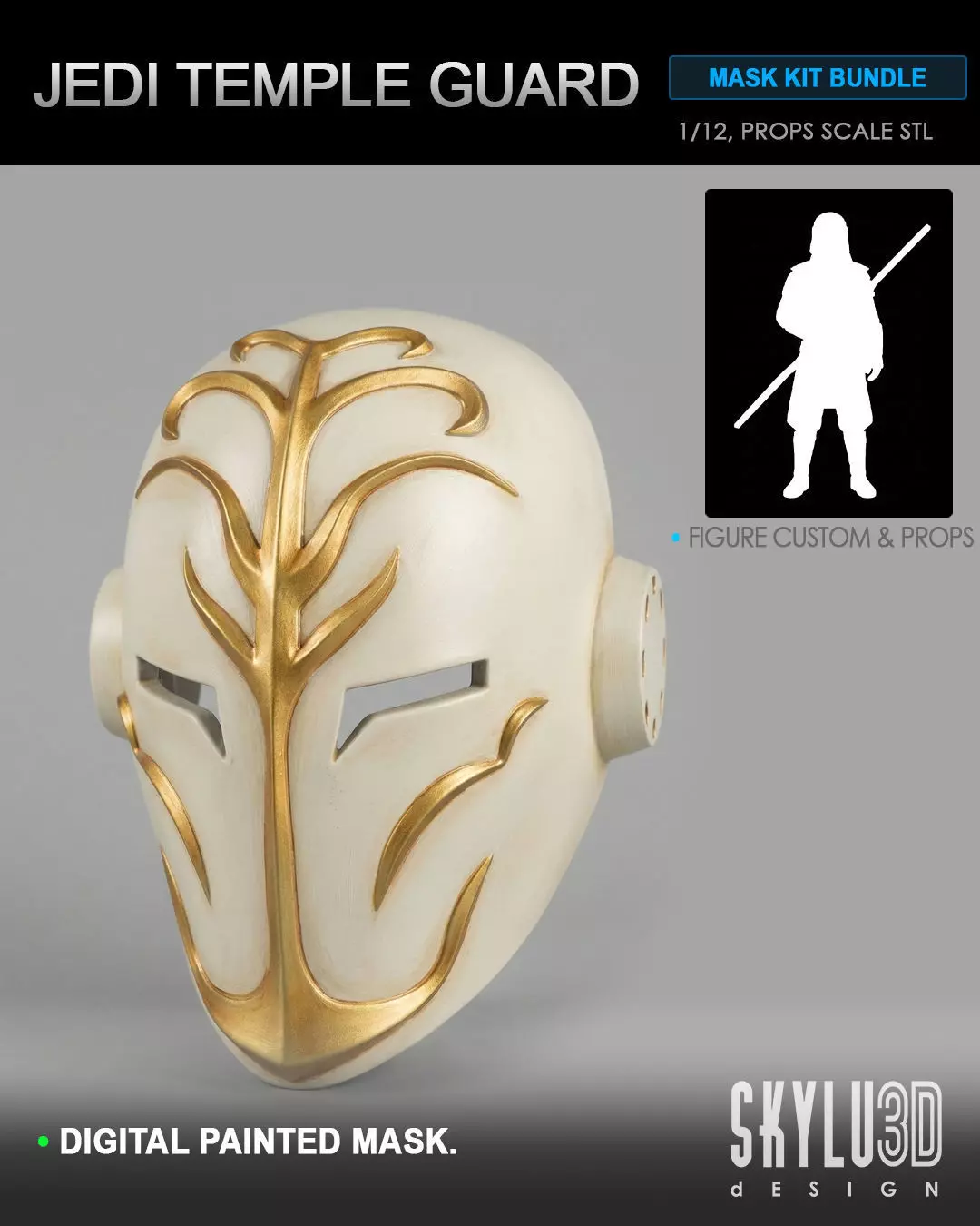 This Jedi Temple Guard mask has been carefully designed for both figure customizers and full-scale prop builders, offered as a bundle scale STL set to cover multiple use cases in one purchase.