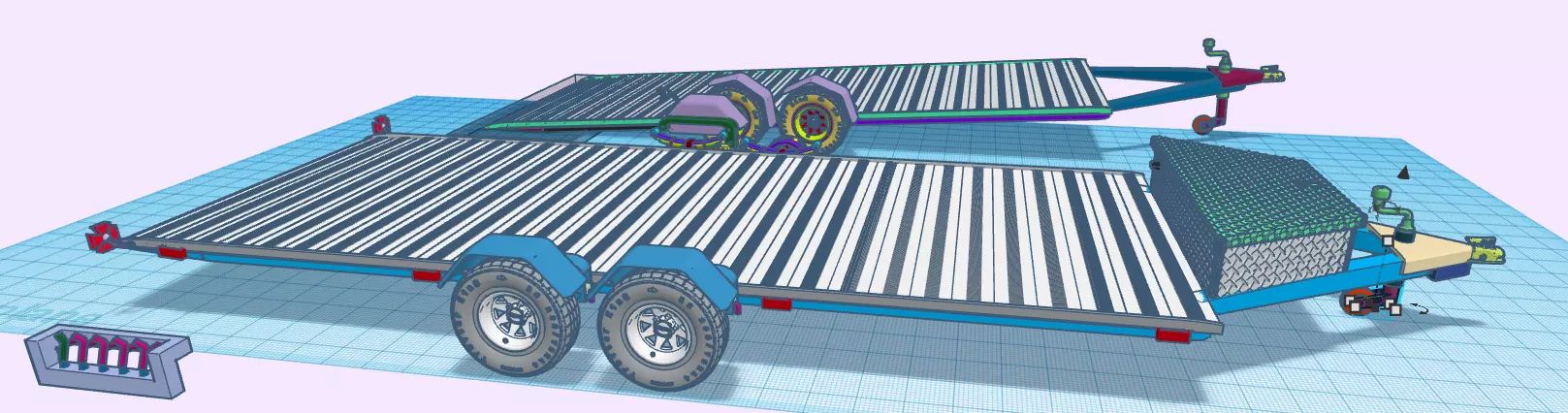 This is a functioning 1/25th scale aluminum low profile trailer, which is use to transport lowriders, lowered car/trucks, super cars etc. It tilts to about 4 degrees. The flat deck is separated into 3 pieces to be able print. Details include Iron Cross Tail lights, tool box, separate side marker lights and 10 spoke trailer wheels. Also includes stake pockets on sides. The design is based on 2023 Timpte drop deck low profile car hauler trailer ground load. Added optional tool box, part 18a which has a recessed license plate.