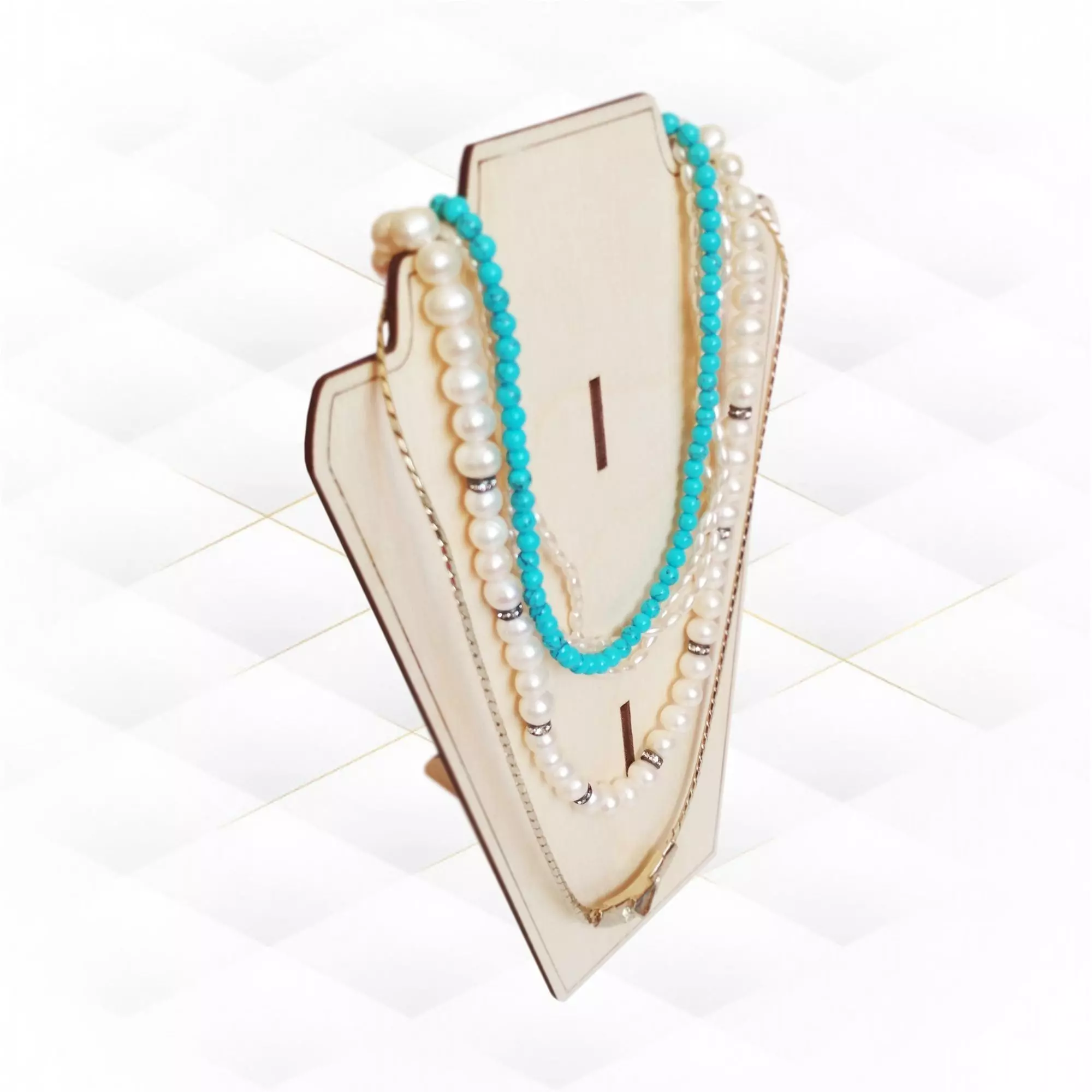 The photos show a Necklace display made of high-quality plywood 3 mm thick. Glue is used for assembly! Dimensions Display:Height - 200 mm (7.9 inches). Width - 133 mm (5.3 inches). Length - 87 mm (3.5 inch).