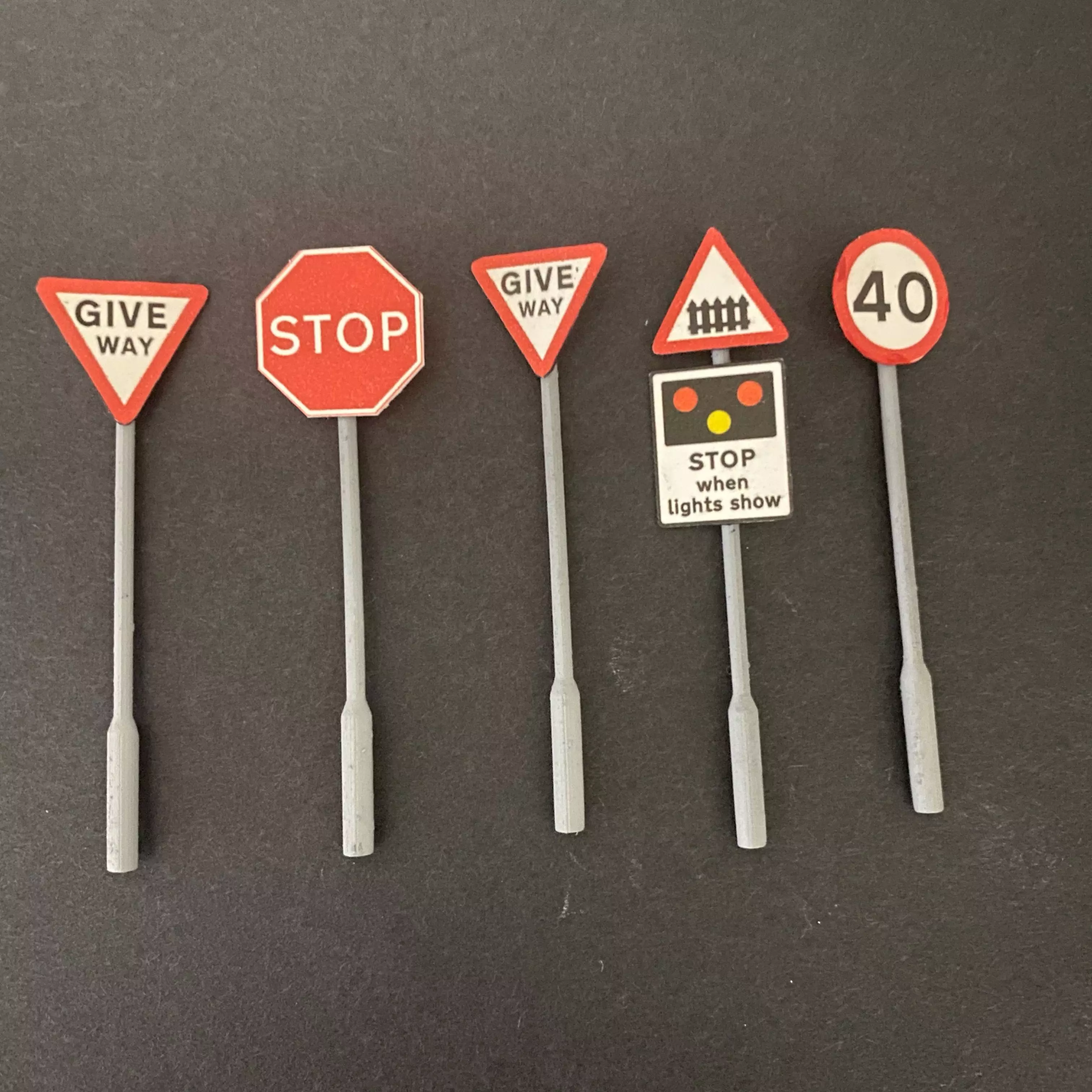 This is a set of road sign posts in 7mm/ft or 1/43 scale that I designed for use on my model railway. I prefer to the use the versions with just the mounting brackets and then I add the roadsign printed on thin card. I have made several different arrangements of brackets to suit various kinds of signs commonly found in the UK.