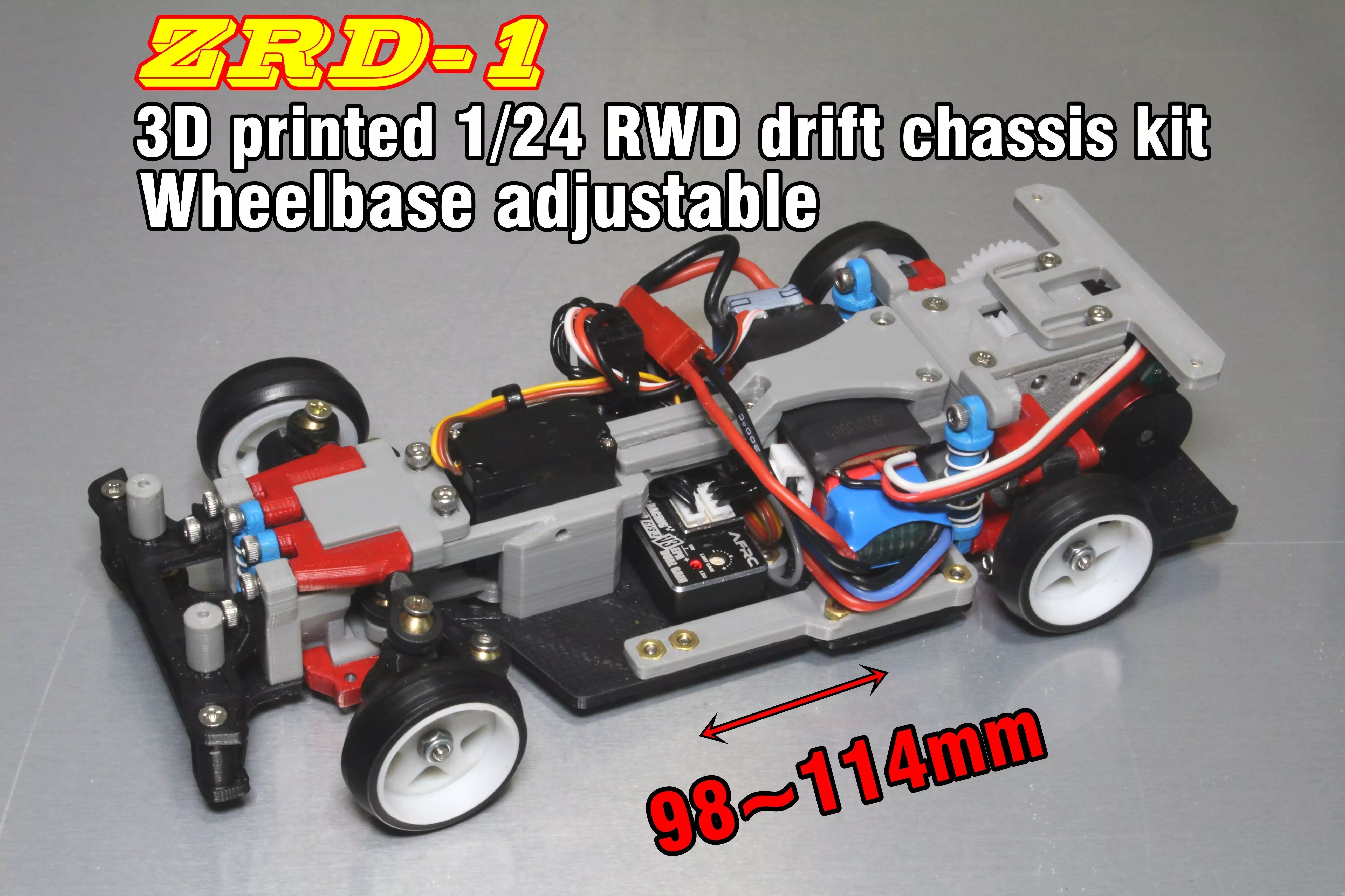 3d printed RWD drift chassis kit for 1/24~1/25 plastic model car.Because it is wheelbase adjustable chassis (98~114mm), it can be applied to bodies of various sizes.I maximized the advantages of 3D printing by designing various optional parts that can respond to variety type of 1/24 bodies.Sliding is stable because it is designed with a geometric structure that makes it easy to drift.The steering angle is large, so even if I make a mistake, the car doesn't seem to spin right away.With this kit, you can make 1/24 high-performance drift car as much as you want.