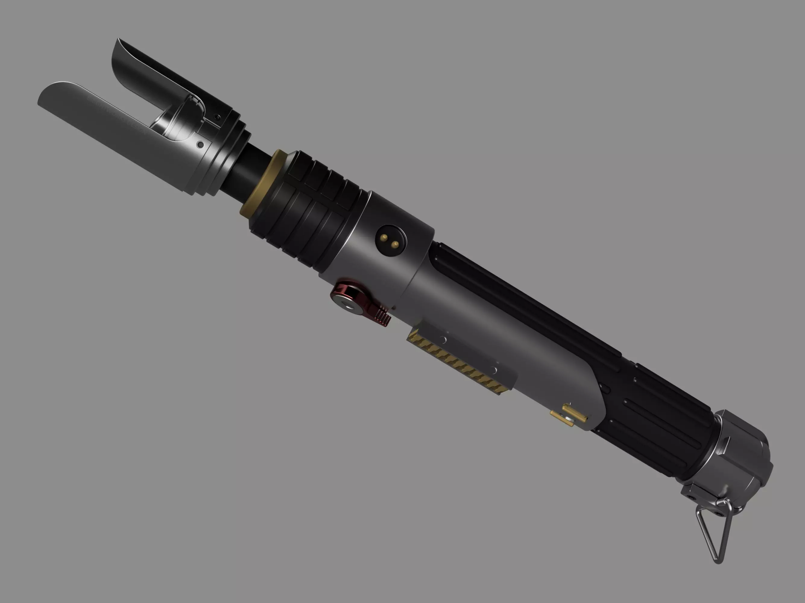 The lightsaber of Sabine Wren, modified after having once belonged to Jedi Apprentice Ezra Bridger. This is modelled from scaled stills of the film’s hero prop.