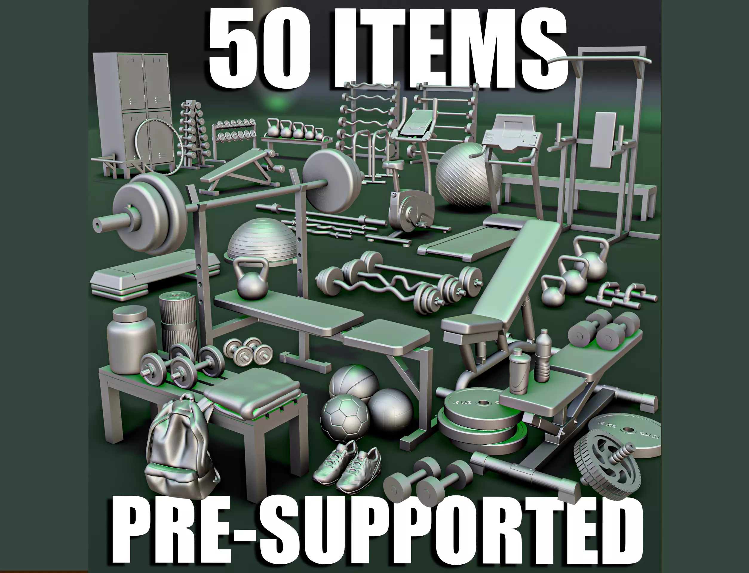 The Pack contains:ab trainer, backpack, balance board, horizontal bar, bar complex, barbell (4 tepes), barbell stand (2 types), bars, basketball, bench (2 types), bench press, sport bottle, water bottle, dumbell (4 types), dumbell stand (2 types), exercise bike, hoop, locker room bench (2 types), locker, mat, press roller, protein, push ups, sneakers, soccer ball, step platform, towels, treadmill, volleyball, vulture (4 types), weight (5 types), weight stand, yoga ball