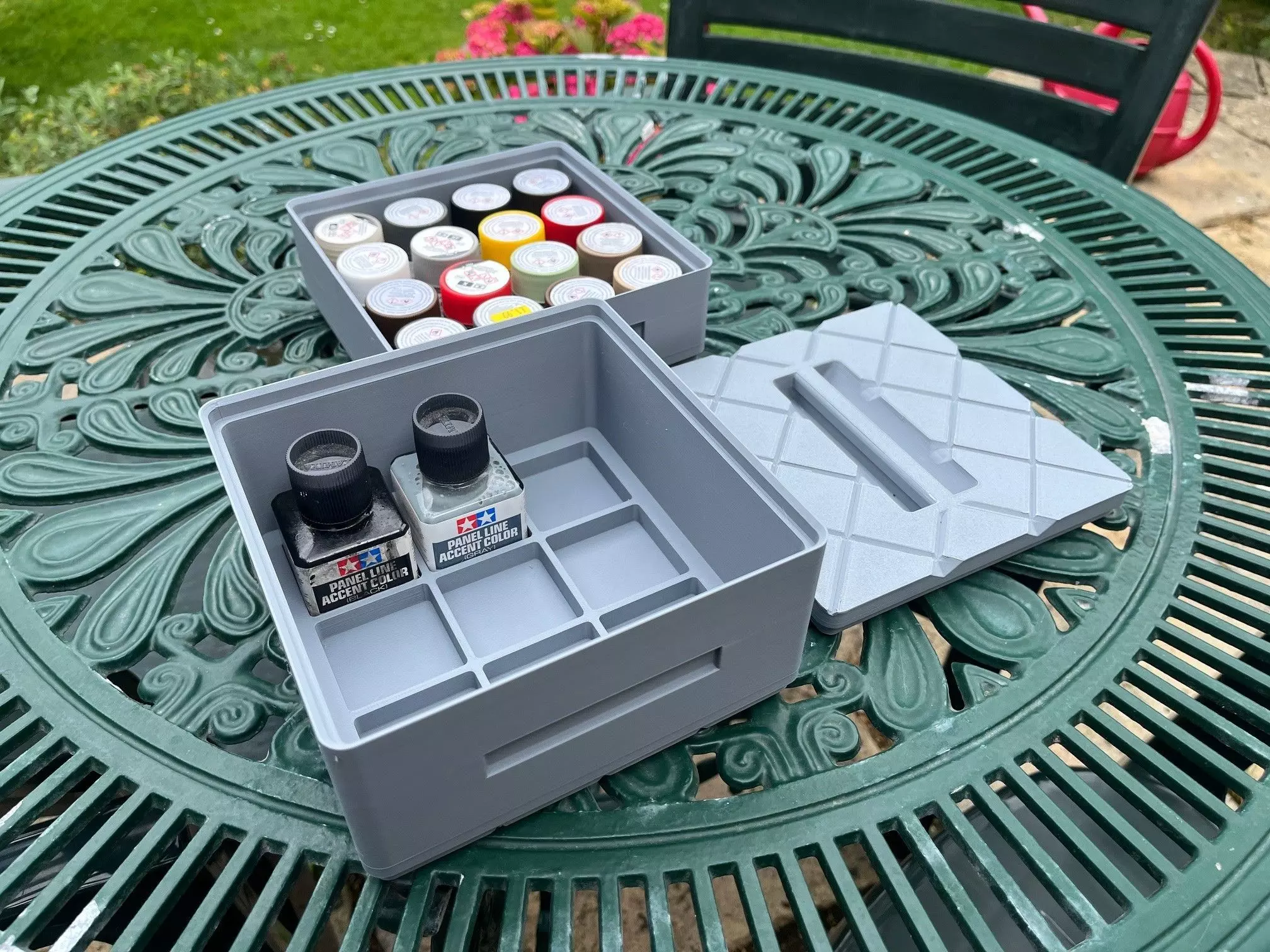 Tamiya 10ml Jar Storage Box https://www.cgtrader.com/3d-print-models/hobby-diy/hand-tools/stackable-tamiya-paint-storage-boxesTamiya 40ml Square Bottle Storage Box https://www.cgtrader.com/3d-print-models/hobby-diy/other/stackable-tamiya-40ml-square-bottle-storage-boxesHumbrol 14ml Tin Storage Box https://www.cgtrader.com/3d-print-models/hobby-diy/other/stackable-humbrol-paint-14ml-tin-storage-boxesHumbrol 14ml Dropper Bottle Storage Box https://www.cgtrader.com/3d-print-models/hobby-diy/other/stackable-humbrol-paint-14ml-acrylic-dropper-storage-boxesHumbrol 28ml Bottle Storage Box https://www.cgtrader.com/3d-print-models/hobby-diy/other/stackable-humbrol-28ml-bottle-storage-boxes-for-cote-maskol-washRevell 14ml Tin Storage Box https://www.cgtrader.com/3d-print-models/hobby-diy/hand-tools/stackable-revell-paint-14ml-tin-storage-boxesRevell 18ml Aqua Color Storage Box https://www.cgtrader.com/3d-print-models/hobby-diy/other/stackable-revell-aqua-color-paint-18ml-container-storage-boxesRailMatch 15ml Enamel Storage Box https://www.cgtrader.com/3d-print-models/games-toys/game-accessories/stackable-railmatch-enamel-paint-15ml-jar-storage-boxesRailMatch 18ml Acrylic Storage Box https://www.cgtrader.com/3d-print-models/hobby-diy/other/stackable-railmatch-acrylic-paint-18ml-pot-storage-boxesVallejo 17ml Dropper Bottle Storage Box https://www.cgtrader.com/3d-print-models/miniatures/other/stackable-vallejo-paint-17ml-dropper-bottle-storage-boxes