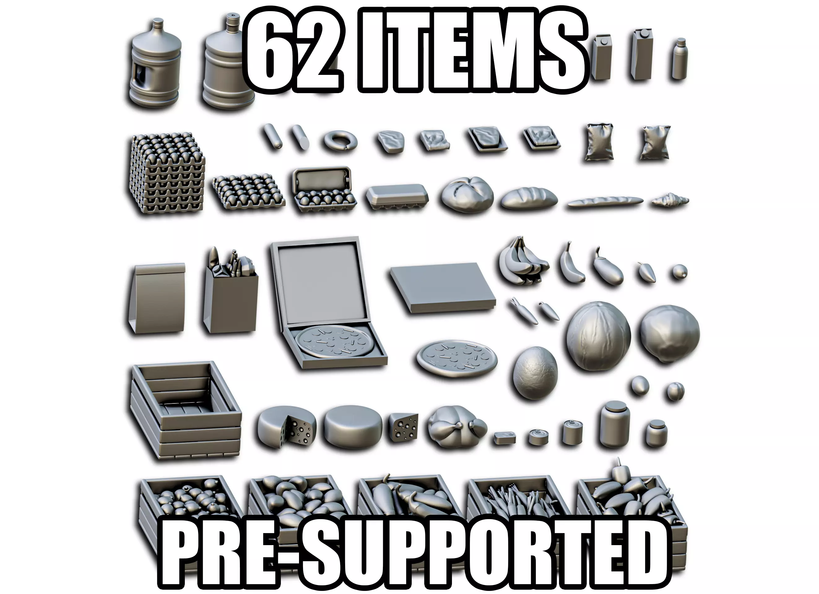 The Pack contains:Apple, banana, bananas, beer bottle, water bottle, water bottle 20L (2 types), wooden box, bread (3 types), cabbage, can (2 types), canned food (3 types), carrot, carrot box, cheese (3 types), chicken, chips (2 types), croissant, eggs (4 types), jar (2 types), juice (2 types), lemon, lemon box, meat (4 types), melon, milk (2 types), package with food (2 types), pepper (2 types), pepper box, pizza (3 types), potato, potato box, rum bottle, sausage (3 types), vine bottle, vodka bottle, watermelon, zucchini, zucchini box