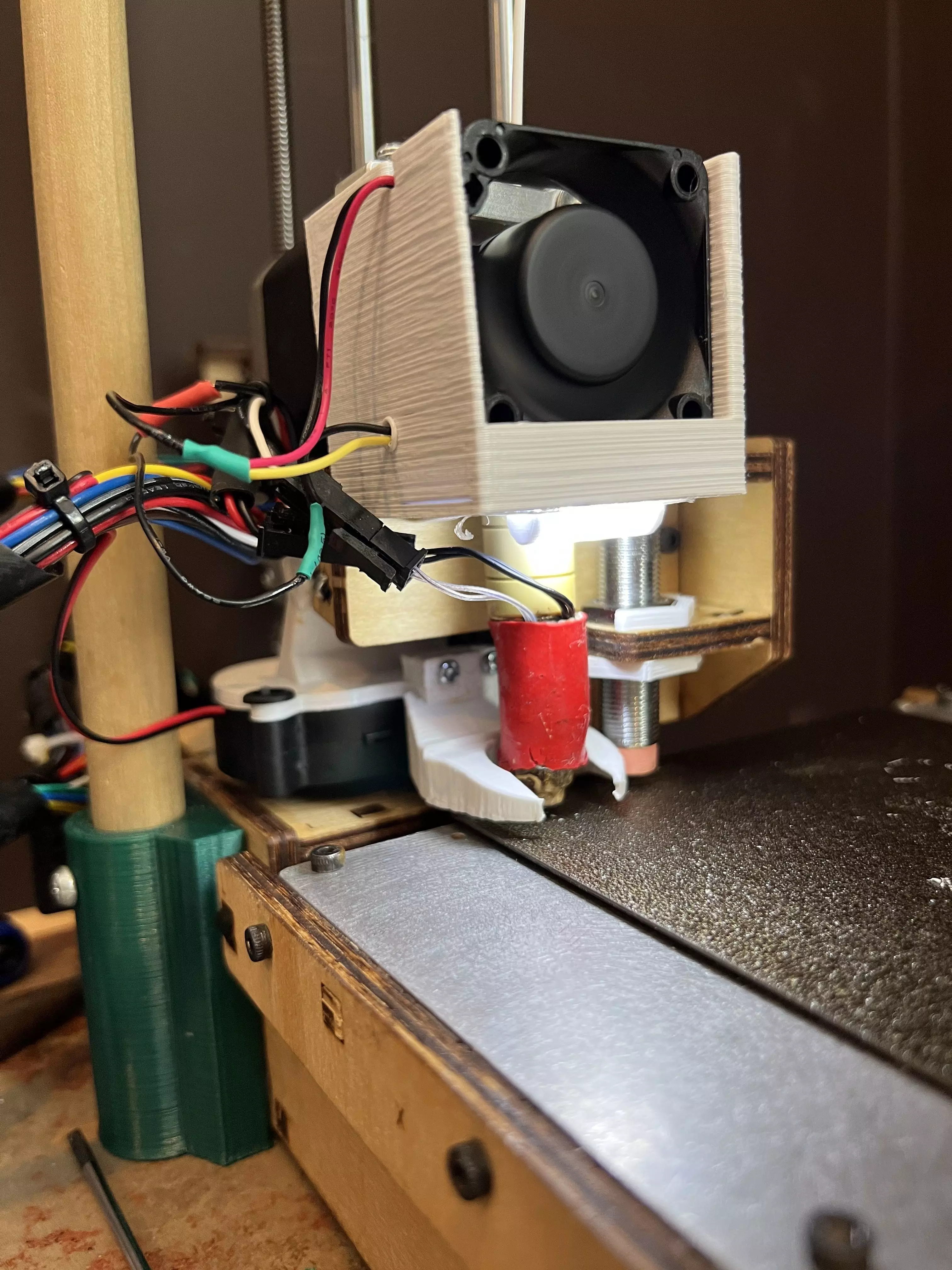 Blower fan mount: Upgrade to a powerful blower fan to improve your print quality. Fits 50 mm x 15 mm Blower Fan, Amazon Asin p/n: B071WMHNG5.The model consists of a mount that connects the blower fan to the printer and also two different manifolds that shape the flow over the hotend. These need to be fastened to the mount with screws. You may need to reduce the maximum fan speed in your slicer settings as this solution is very efficient and can even freeze filament in the hotend if used on full blast. This upgrade greatly improved the quality of my printing.