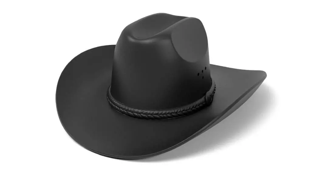 This 3D printed Western-style hat captures the classic cowboy look featuring a sleek black finish and a detailed braided band.