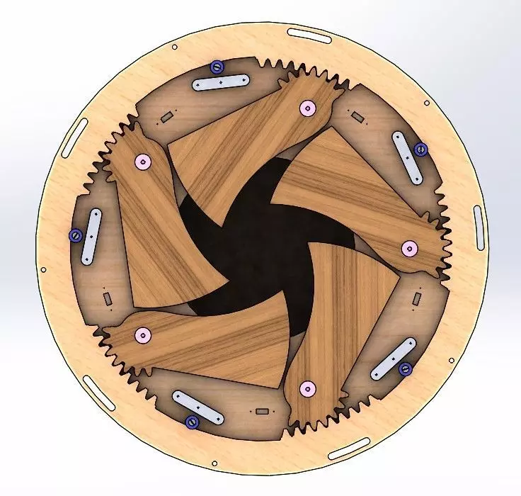 Rotating Iris type dining table. Most parts are made from wood. You can put dinnerwares inside the table,such as forks, knife, spoon, plate, wine.When you rotate the second wood plate, the dinning table open or close. There are 10 side wall below the bottom plate as legs. And 5 of them are movable. You need to prepare some bolts, wood screws, and handtools to assemble parts together.The table height is 80cm, the center hole is diameter 80cm, and the table diameter is 200 cm.STEP, DXF, STL, CAD plan(pdf), partlist(bill of material),3DPDF are included in the attachment.In theory, the files can be used to manufacture parts directly. But it is best to understand the structure first, and then you can make some change as needed.Ignore the FBX and OBJ format files, they are only used to meet cgtrader's requirement.