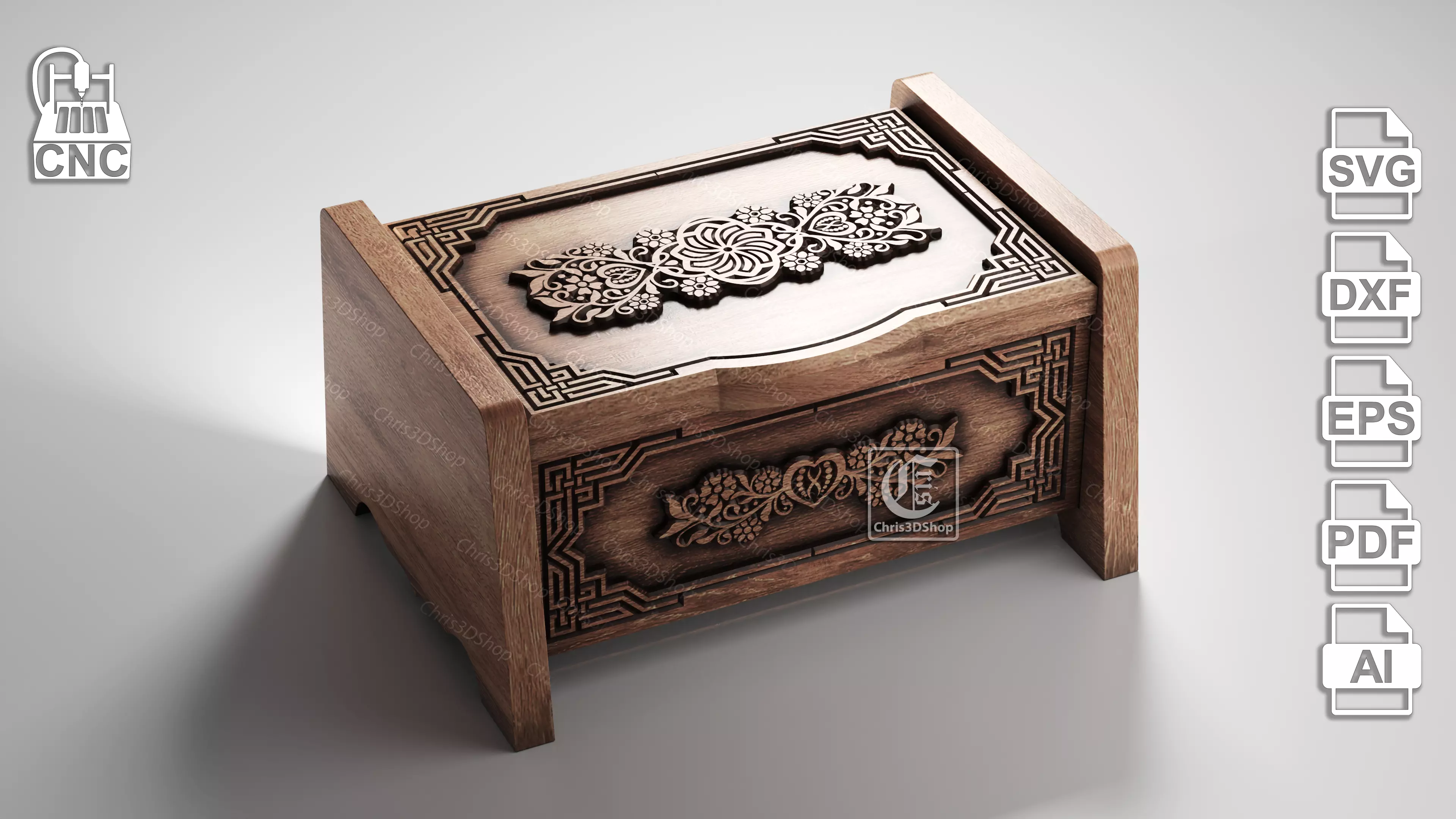 V-Carved Wooden Box - Project for CNC in the following formats: SVG, DXF, ESP, AI and PDF.The model can be used with Aspire, Artcam, Vcarve, Carveco or any other software that allows you to import one of the specified formats.