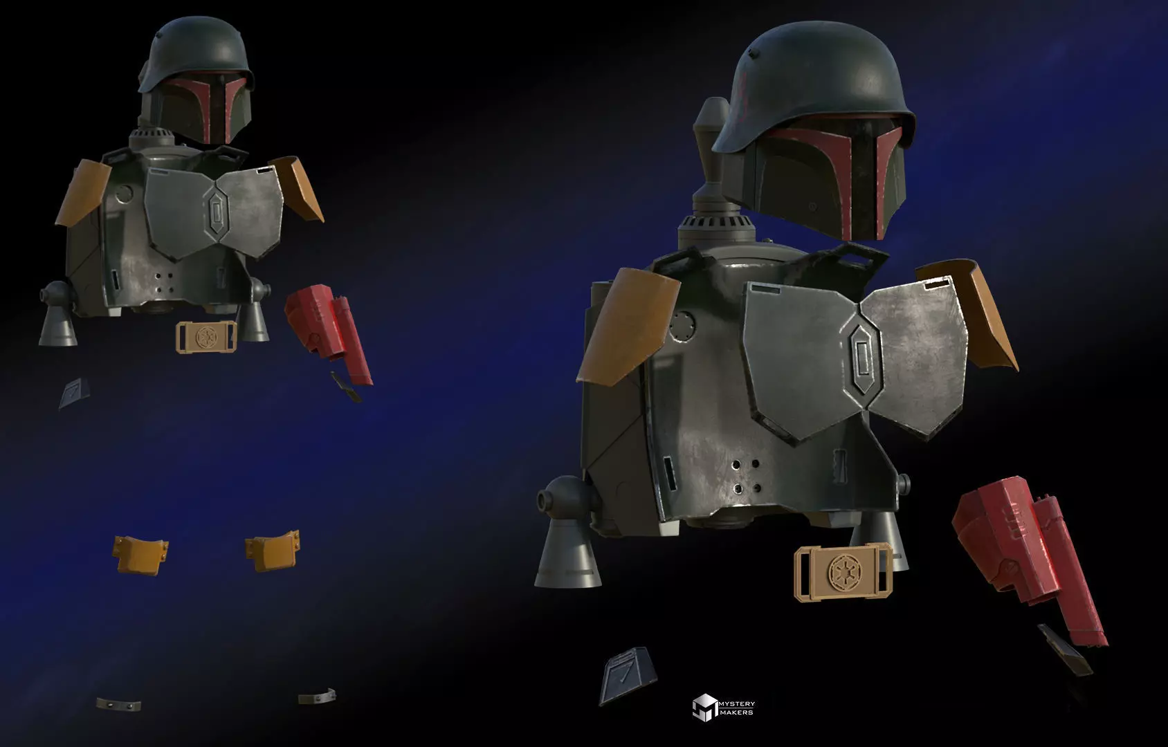 Helmet4 grav charges that light upBack plate (standalone version – for display or without jetpack)Back plate BOBF version – compatible with JJ Industries jetpack mountsJetpack (BOBF compatible, with new WW2-style details)Hand platesShoulder platesChest plate (split for easier printing and assembly)2 belt buckles – Empire and Mythosaur versionsKnee platesBoot platesVambrace/flamethrower with snap-lock systemJoin our community and find out more at:https://www.facebook.com/groups/3282336185171090