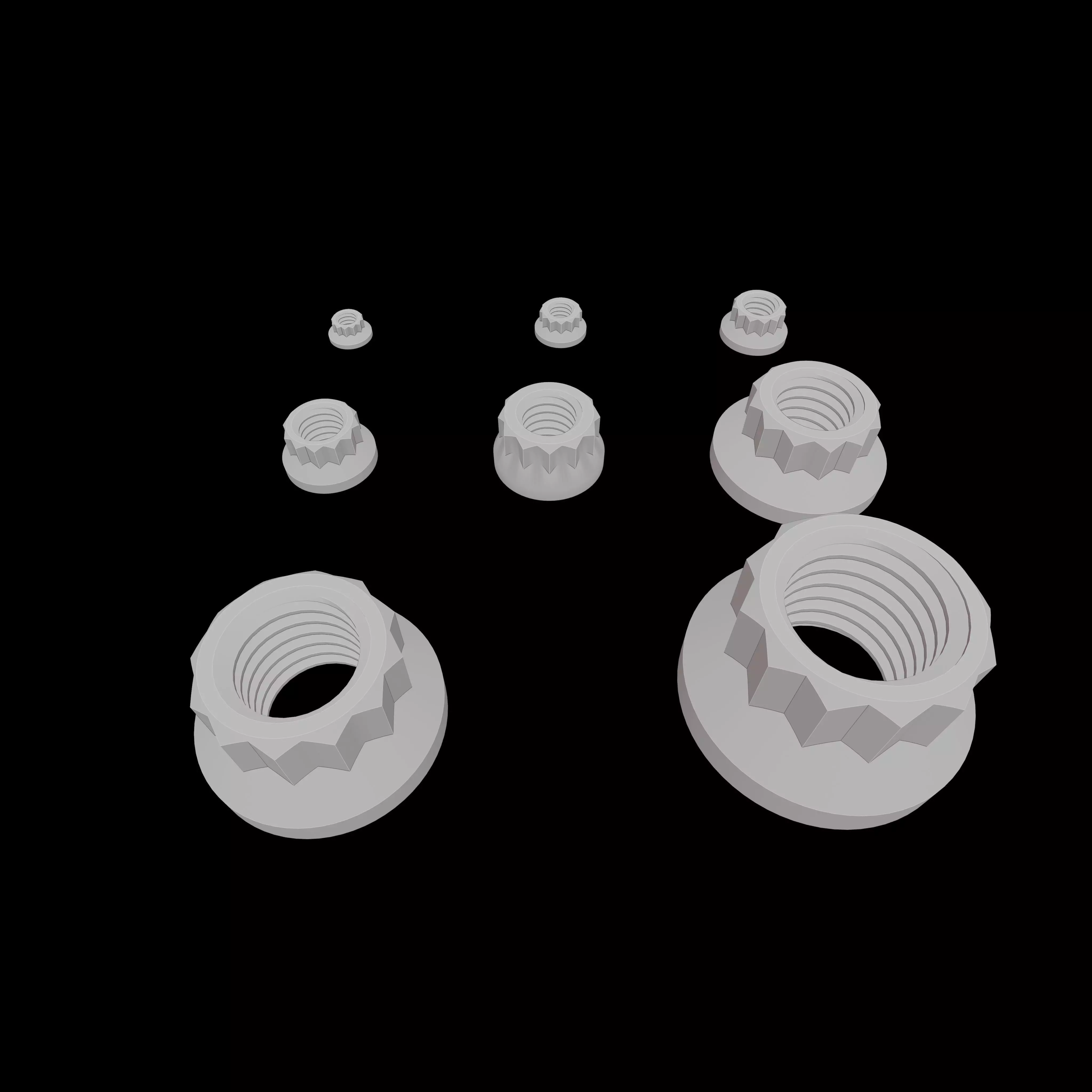 This 3D model set features a collection of 12-point flange nuts designed specifically for 3D printing applications.Each nut is modeled with clean geometry and consistent proportions, presented in multiple sizes arranged as a batch based on nut dimensions.