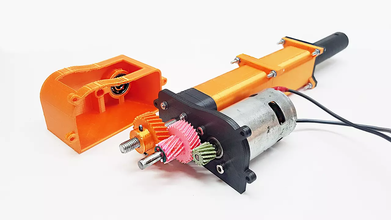 Hi,I designed this linear actuator. You can print these parts with 3d printer and it's works harmoniously. You know this things provides a linear movement. I used 775 motor (100 watt) and I get a cool results. So the maximum axial load theoritically 250 Newton(~25 kg or ~ 56 lb). But if you use 775 motor which is one of 150 watt, this time axial load will theoritically 380 Newton (~38 kg or ~ 85 lb). The Piston stroke is 120 mm and piston speed about 30 mm/s. So 4 sec to required to full stroke. There is a small gearbox in the system. It has a 6 gear ratio. I used helical gears and they have m=0.8 mm and m=1 mm normal modules. The threaded rod is 8 mm diameter (M8) and the shaft of second stage has a 6 mm diameter. Nuts also M8. I used three 608zz ball bearings for support to threaded rod. If you make this project, The body does not need to be so strong. Because the body only meets the friction force between the lead screw and the nut. So you can print with %20 infill and 0.2 mm layer height for stationary parts.You should print the gears with lower layer height (0.12 mm -0.16 mm). Infill for the gears its good % 50 or %100