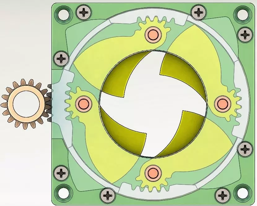 The whole mechanism can be used as a functional unit. When you rotate the “Drive Gear” or the “Ring” , the blades in the center hole open or close gradually. It is similar to a camera aperture or iris diaphragm. A motor can be used to drive the mechanism.