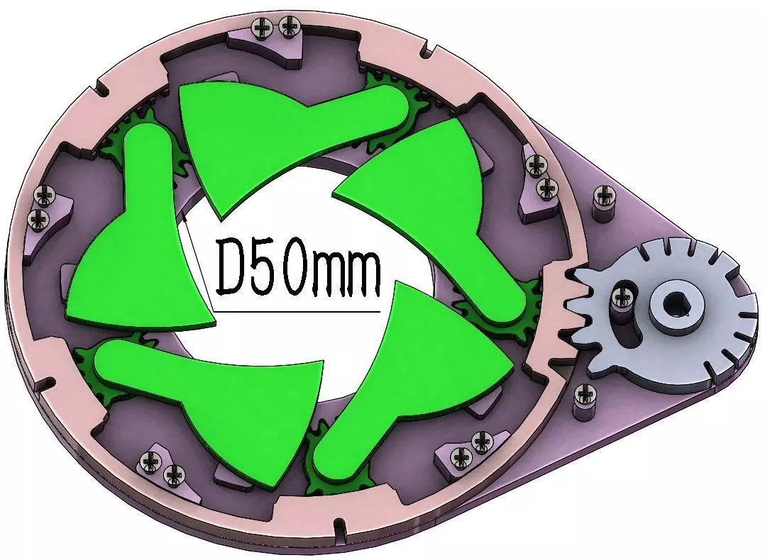 When you drive the small gear, the center hole can open or close gradually. The center hole is diameter 50mm. To assemble the parts togther,some M2 screws are needed.Parts are designed for 3d printing. It is best to use resin material when 3d printing. And you may need to sand some parts due to the 3d printing quality. You can drive the mechanism with hand, Or you can assemble a motor to make it work too. It is a DIY project.STL and STEP format files are included.Ignore the FBX and OBJ format files, they are only for cgtrader's requirement. The pdf file is 3d pdf format, you need to open it with a program that support 3d content. of course,if you cannot open the 3d pdf file,it is not a problem,because it is only used to show you the structure.