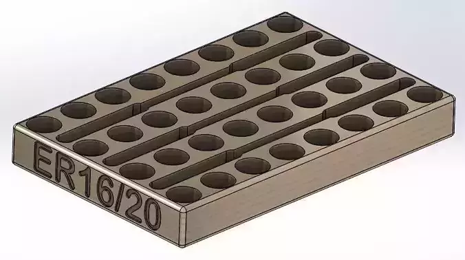 File: ER20 Tray.stlName: ER16 - ER20 Collet TrayPLA Material: 221.5 grams ( 0.488 lbs) Infill = 10%Size: 210.69 mm (8.295 ") x 136.52 mm ( 5.375") x 25.4 mm (1.000")Resolution: 0.20mmLayers: 133 layers Rafts: Yes Supports: NoPrint Time: 19 hr 35 minFunction: If printed 1:1, this will produce a tray that will hold up to 32 ER16 or ER20 collets and up to 3 spanner tools. Originally designed as a wooden CNC part, that was made from a 2"x8" piece of lumber that would perfectly fit in a small Flat Rate Priority Mail box. This version is shorter and the collet holds are smooth, not stair-stepped.Tags: ER16, ER20, Collet, Chuck, Tray, Spanner, CNC, Machining