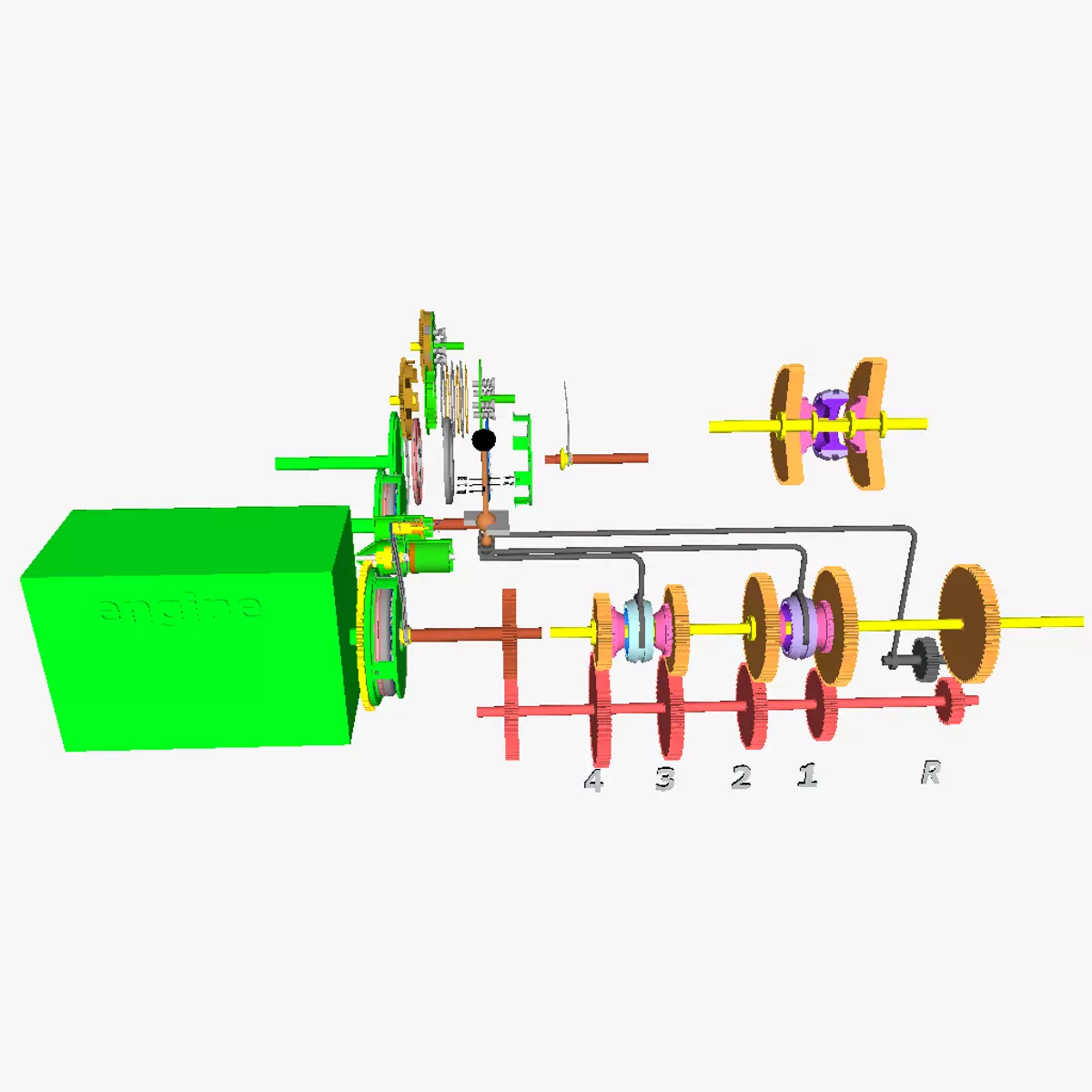 3D model of the transmission of an internal combustion motor. The transmission includes: friction clutch, gearbox. On the IC motor, a gear teeth are also visible on the flywheel, these are used by the starter motor to start the internal combustion motor. 2 types of clutch are visible in the model; one used in cars, the other used in motorcycles (called a “basket clutch”). The manual (or standard) gearbox works as follows: A gearbox works by connecting one of the orange gears with the output shaft (the orange gears rest on, but are not fixed on the output shaft). The orange gears are already connected to a gear fixed on the layshaft, in turn connected to the input shaft (which is connected to the engine), so the closing of the connection to the output shaft will relay the power to the wheels. The connecting is done by means of the internal cone, synchronizer sleeve, external cone & drive dogs. See the 'Purchasing_the_models' link at appropedia's AT_CAD_Team for additional information on the model
