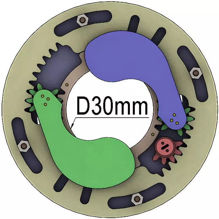 It is a mechanism similar to shutter mechanism. There are two leaves. The shape is similar to Chinese Taiji or Tai Chi.When you rotate the Drive Partor the middle plate, the blades inside the center hole can open or close gradually. The center hole's MAX diameter is 30mm, outer size is diameter 74mm and thickness is 8 mm. Most parts are designed for laser cut. The parts' thickness is 2 mm. Most parts can be 3D printed too, it you plan to do that, resin material should be the best option.But the 3d print version may be better.