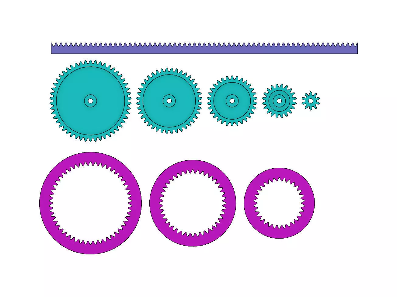 Mini set of metric spur gears with proper involute tooth profile for 3d printing and laser cutting.